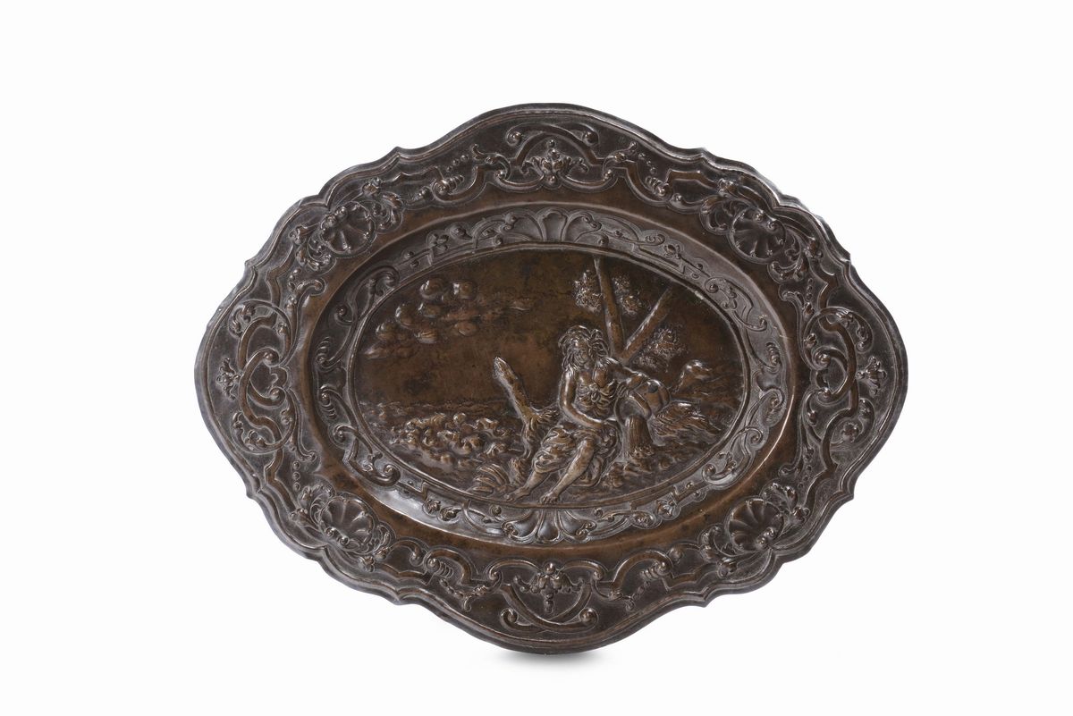 Vassoio sagomato in rame sbalzato con divinità fluviale, XVIII secolo