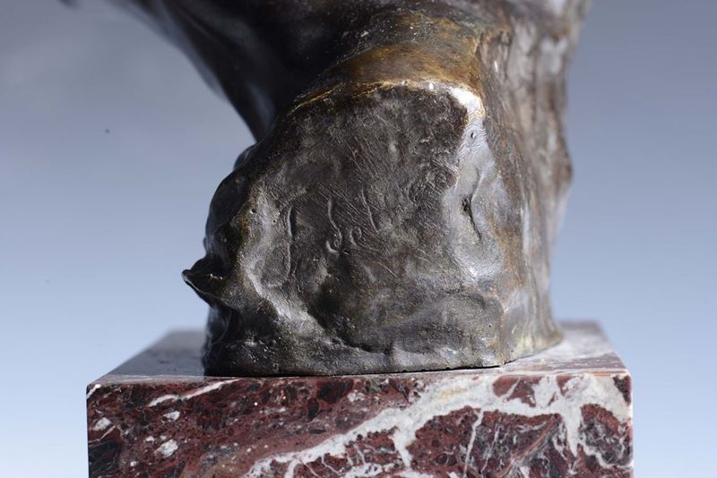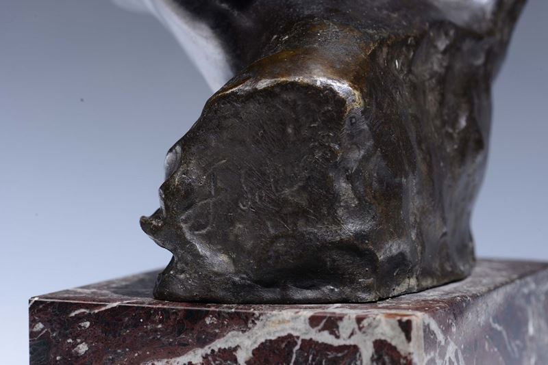 bronzo fuso e cesellato su base in marmo verde striato, altezza cm 21,5, con base cm 33.