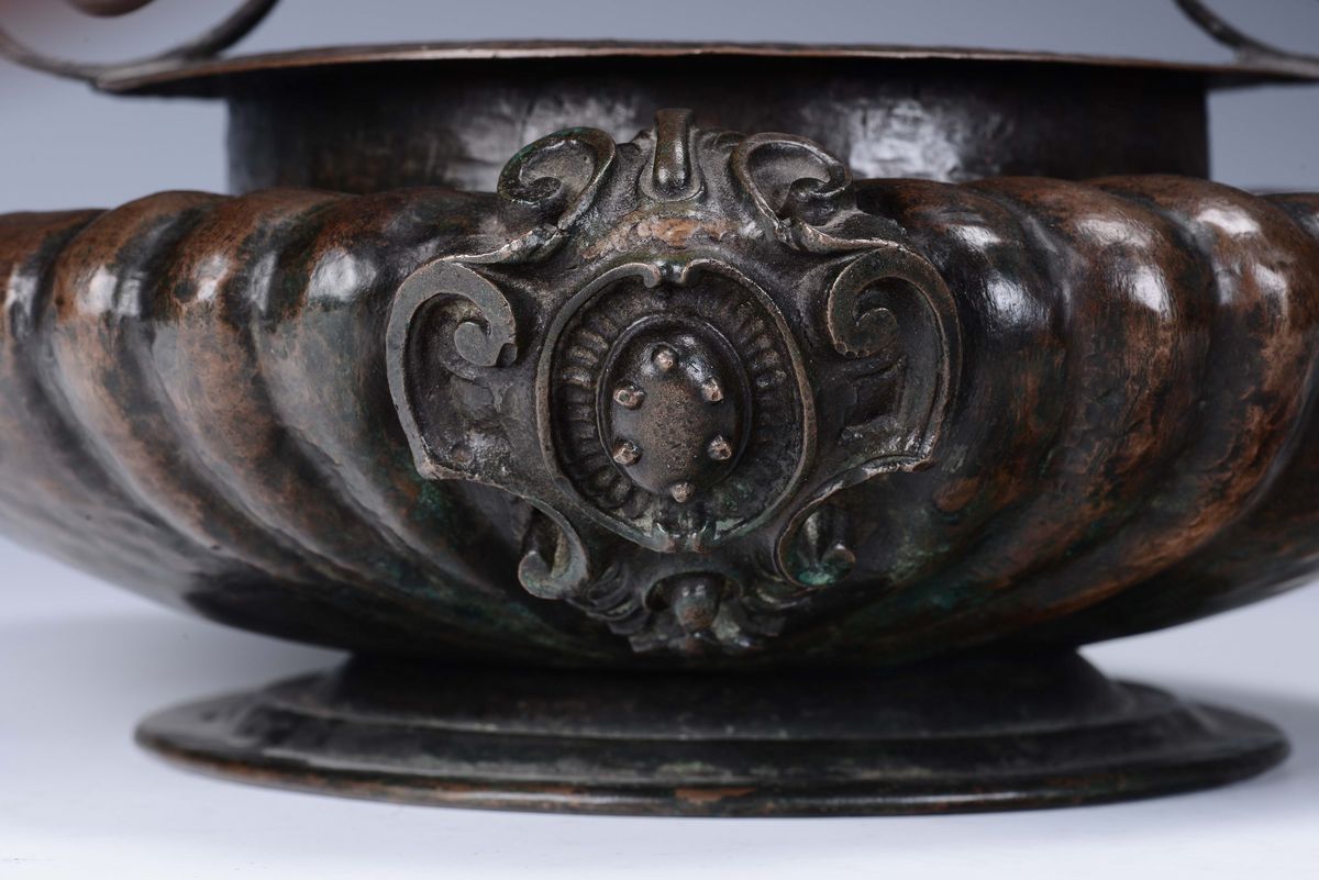 Il bacile, da corpo baccellato e con manici a ricciolo incisi, presenta un doppio stemma in bronzo con le insegne dei Medici, e testimonia il gusto storicistico nella ripresa di modelli dell'antichità, ottimamente riproposti con maestria dalle botteghe artigiane dell'Italia post-unitaria.