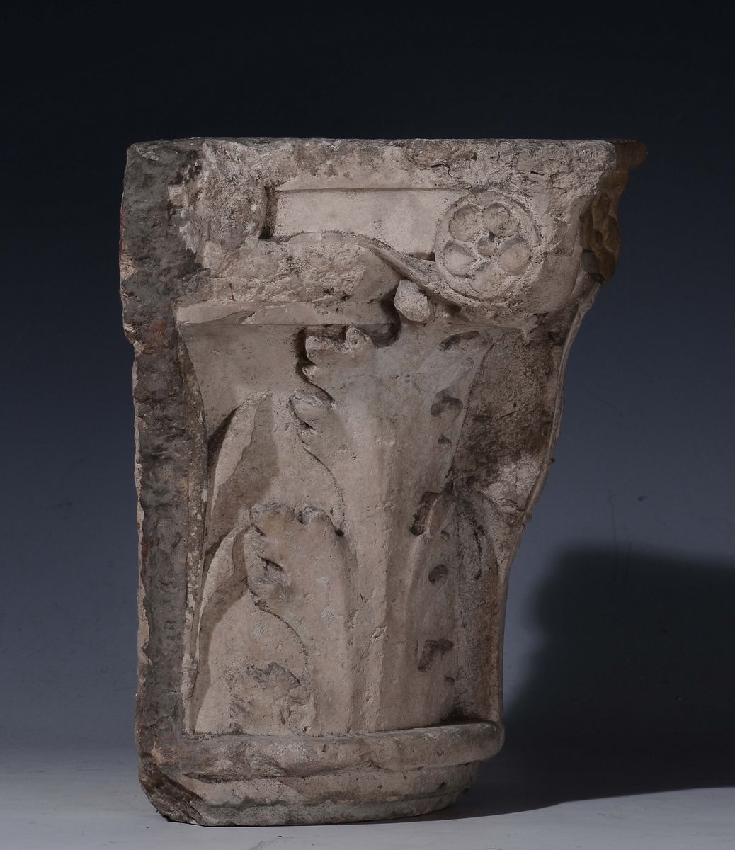 Semicapitello quattrocentesco scolpito con foglie d'acanto e girali. Al centro stemma polilobato con castello e aquila ad ali spiegate