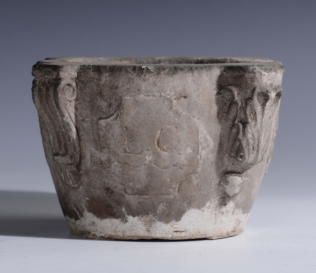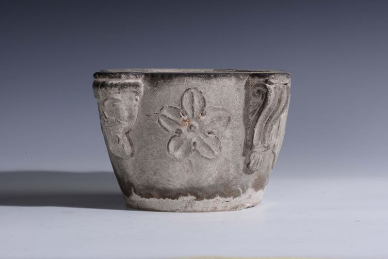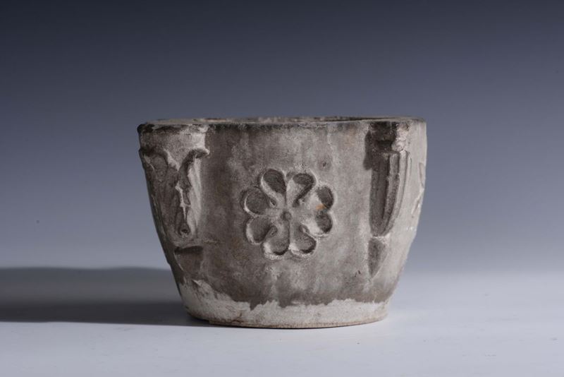 Mortaio circolare con corpo liscio con quattro protome simmetriche una raffigurante volto maschile con mano sul mento, in atteggiamento pensoso, di gusto romanico e raffigurazioni floreali stilizzate sulla fascia.