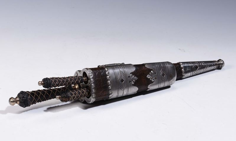 Gruppo di tre posate da caccia composto da due coltelli e forchetta a due rebbi in acciaio. Sulla lama del coltello grande, stemma nobiliare inciso. Custodia in cuoio con rivestimento in argento sbalzato e cesellato coeva ma non pertinente.