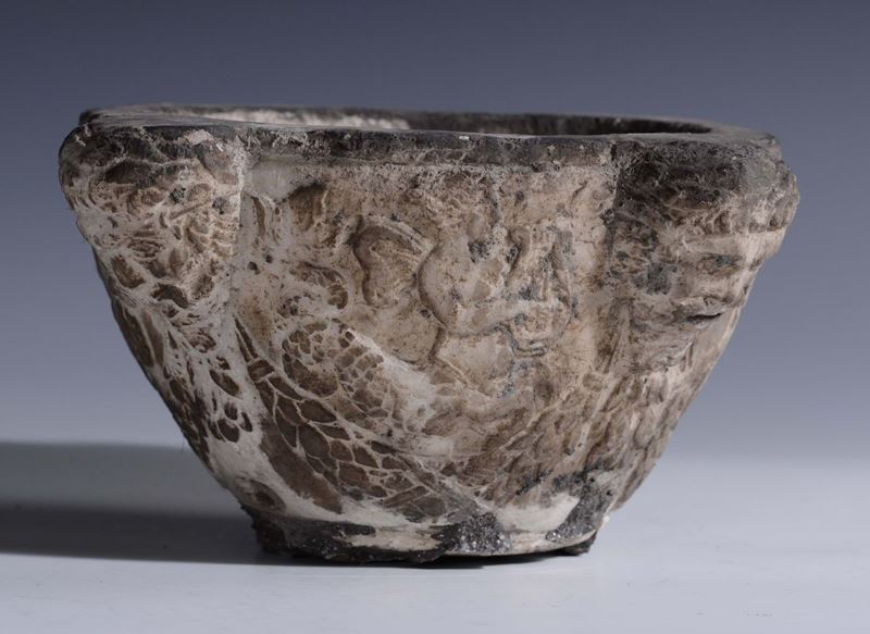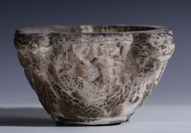 Mortaio con bordo quadrilobato presenta quattro mascheroni aggettanti da cui dipartono festoni fogliacei. Sulla fascia raffigurazioni mitologiche e floreali.