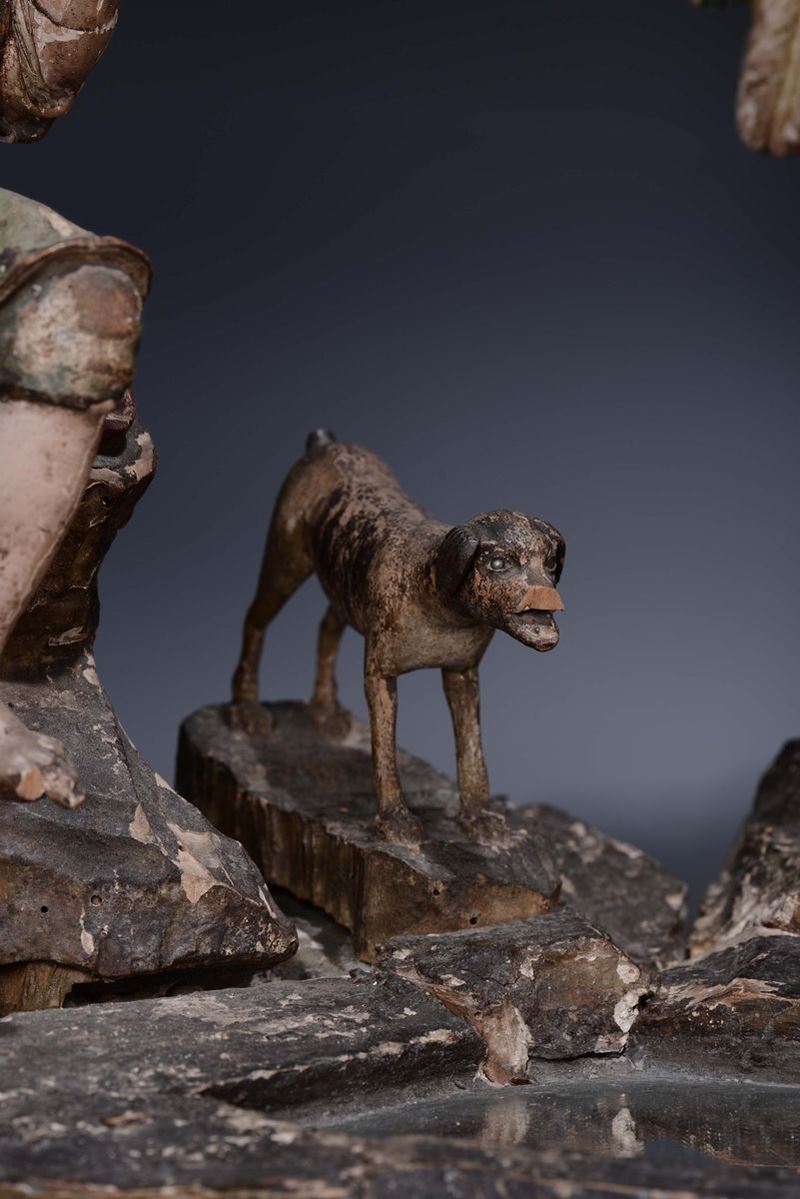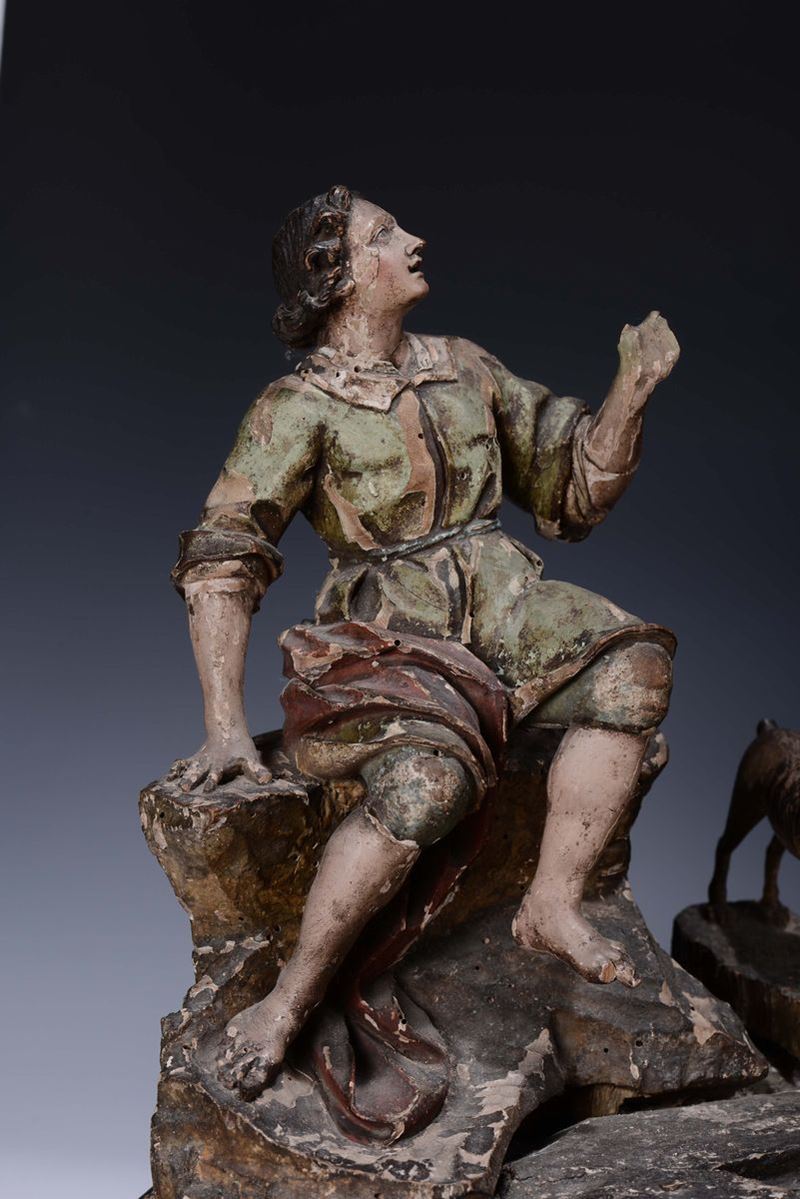 L'insolita rappresentazione dell'episodio biblico fa probabilmente riferimento al momento in cui l'arcangelo dissuade Tobia dal bagnarsi nelle acque del Tigri infestate dall'enorme pesce in seguito catturato dal giovane e usato scopi miracolosi. Il gruppo è scolpito nei modi del barocco settecentesco di cultura napoletana o genovese di cui aderirà la vasta e fortunata produzione presepiale italiana