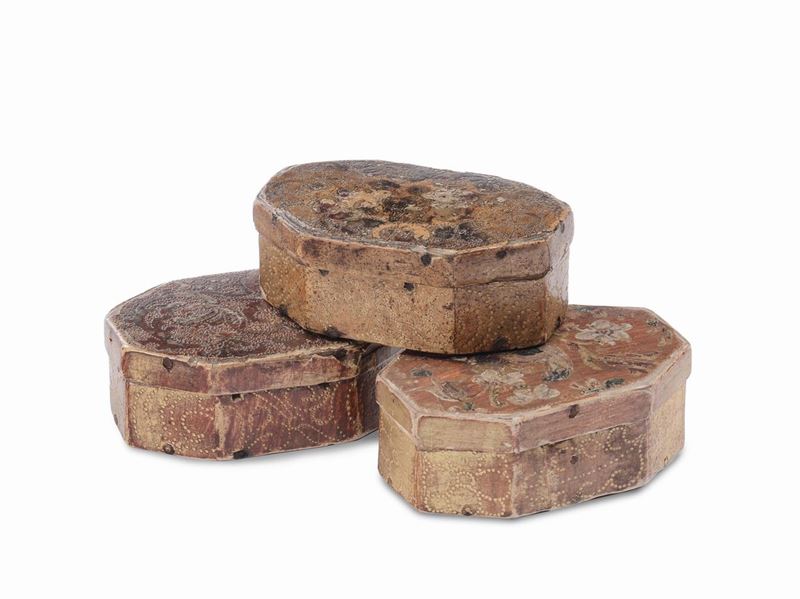 Gruppo di sette scatole in legno sagomato con motivi geometrici lobati e a cuore, dorate ed incise e dipinte con motivi vegetali e figure