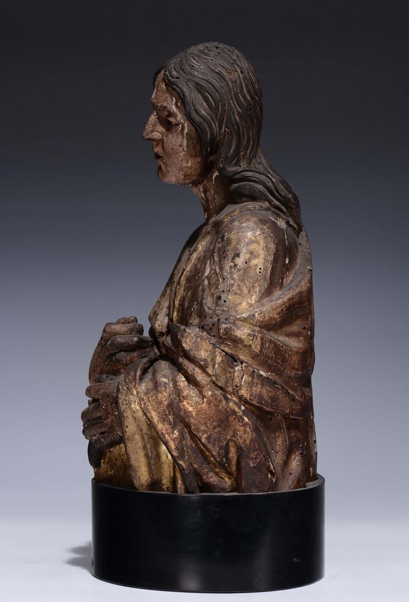 Le due raffigurazioni, a mezzobusto, di due Santi con un libro (forse due evangelisti), caratterizzate da una intensa forza descrittiva e dalla ricchezza e preziosità delle dorature, appartengono a quella cultura rinascimentale che, partendo da Napoli, si sviluppa nell'Italia meridionale fortemente permeata da modelli artistici toscani e dell'Italia del nord. Cfr. - Sculture lignee nella Campania mostra di Palazzo Reale - Napoli 1950. - Scultura del cinquecento in Italia meridionale, F.Negri Arnolfi, Electa Napoli 1997.