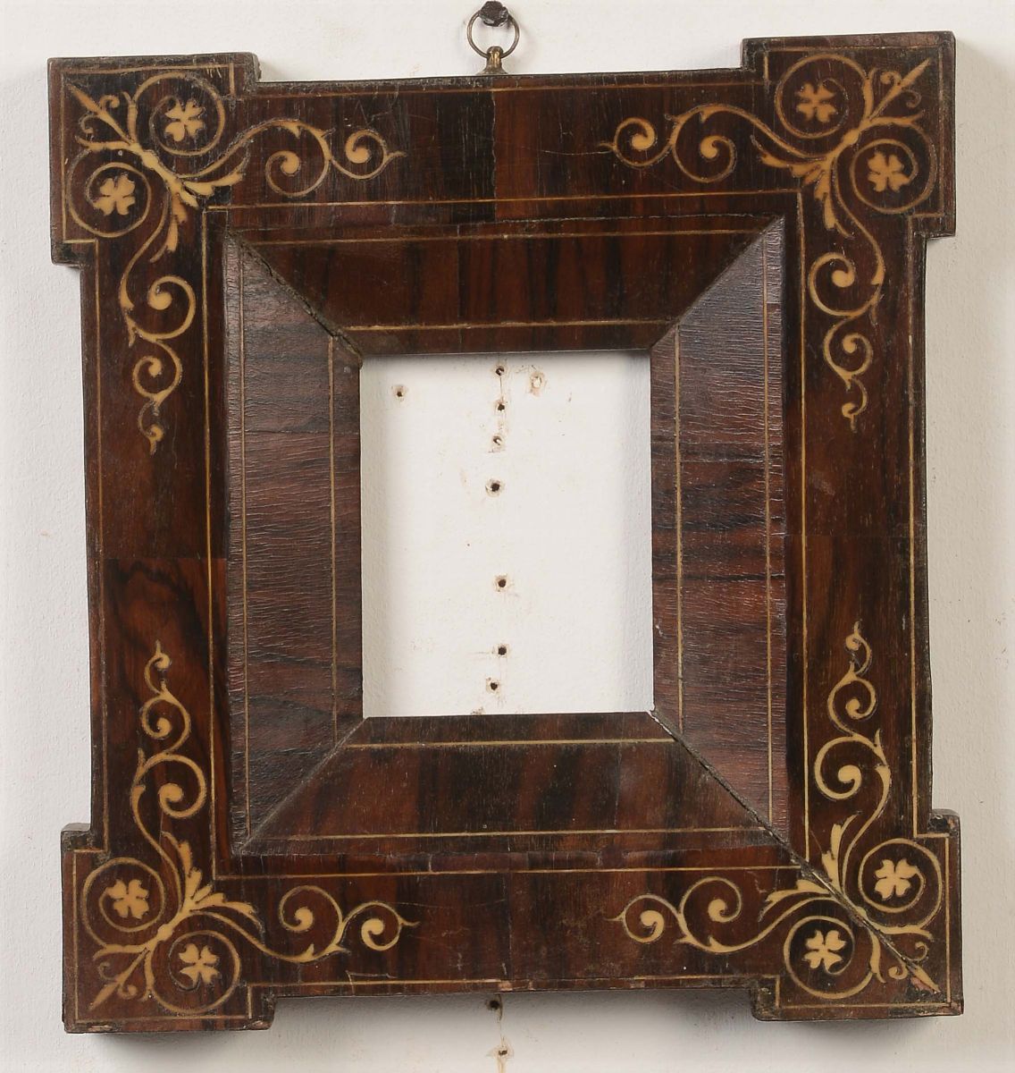 profilo ebanizzato, nel lotto altra cornice intarsiata e filettata con orecchie agli angoli, cm 15,5x12 (22x18) e cm 9x7 (25x22,5)