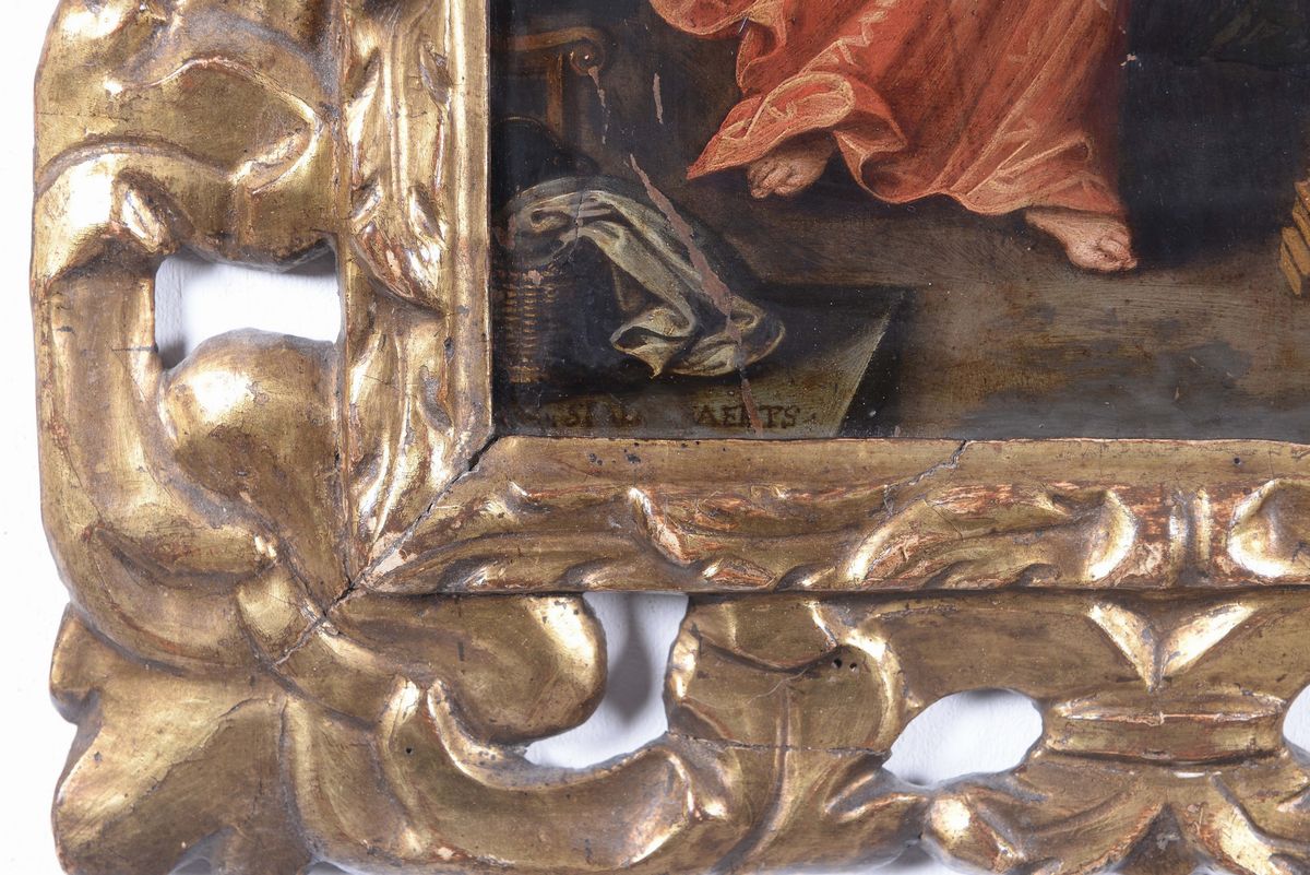 olio su rame, entro cornice coeva intagliata e traforata, fascia a foglie susseguenti, cm 30x 24,5 (46x41)