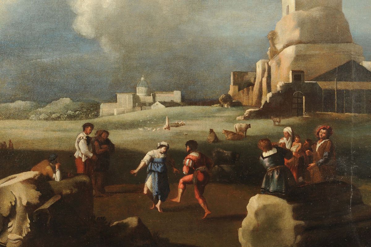 Filippo Napoletano (1587-1629), cerchia di Ballo popolare al foro con san Pietro sullo sfondo