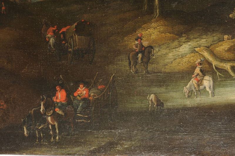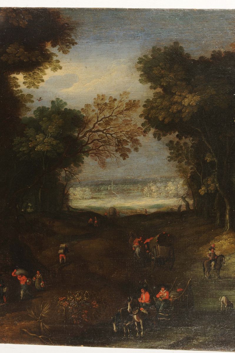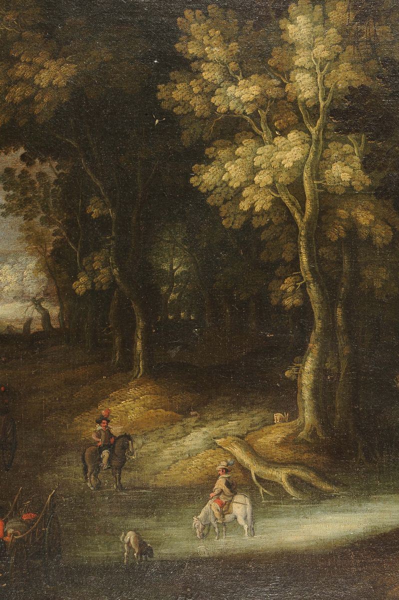 Jan Breughel il Vecchio, (1568-1625), cerchia di Paesaggio boschivo con personaggi