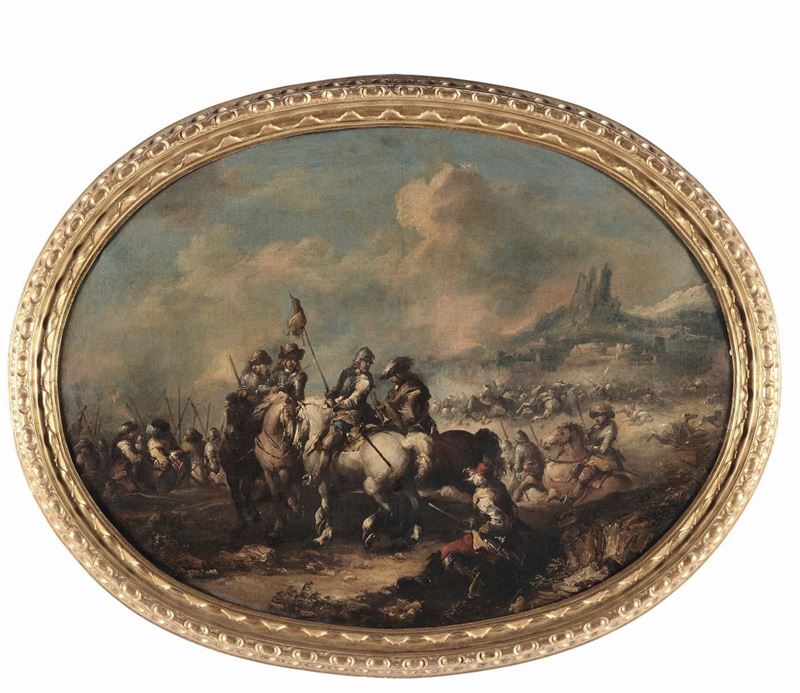 Scuola Italiana del XVIII secolo Coppia di dipinti raffigurante battaglia con cavalieri