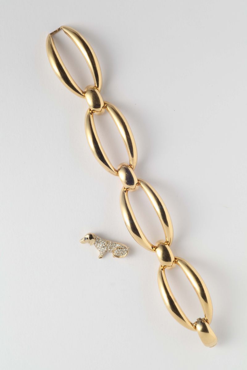 A gold bracelet with a diamond brooch