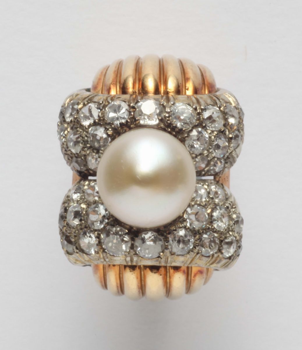 A pearl, diamond and gold ring. 1930 circa