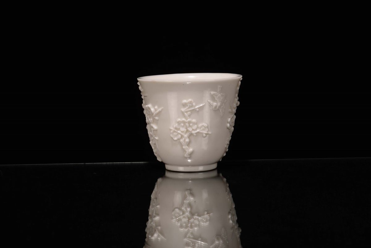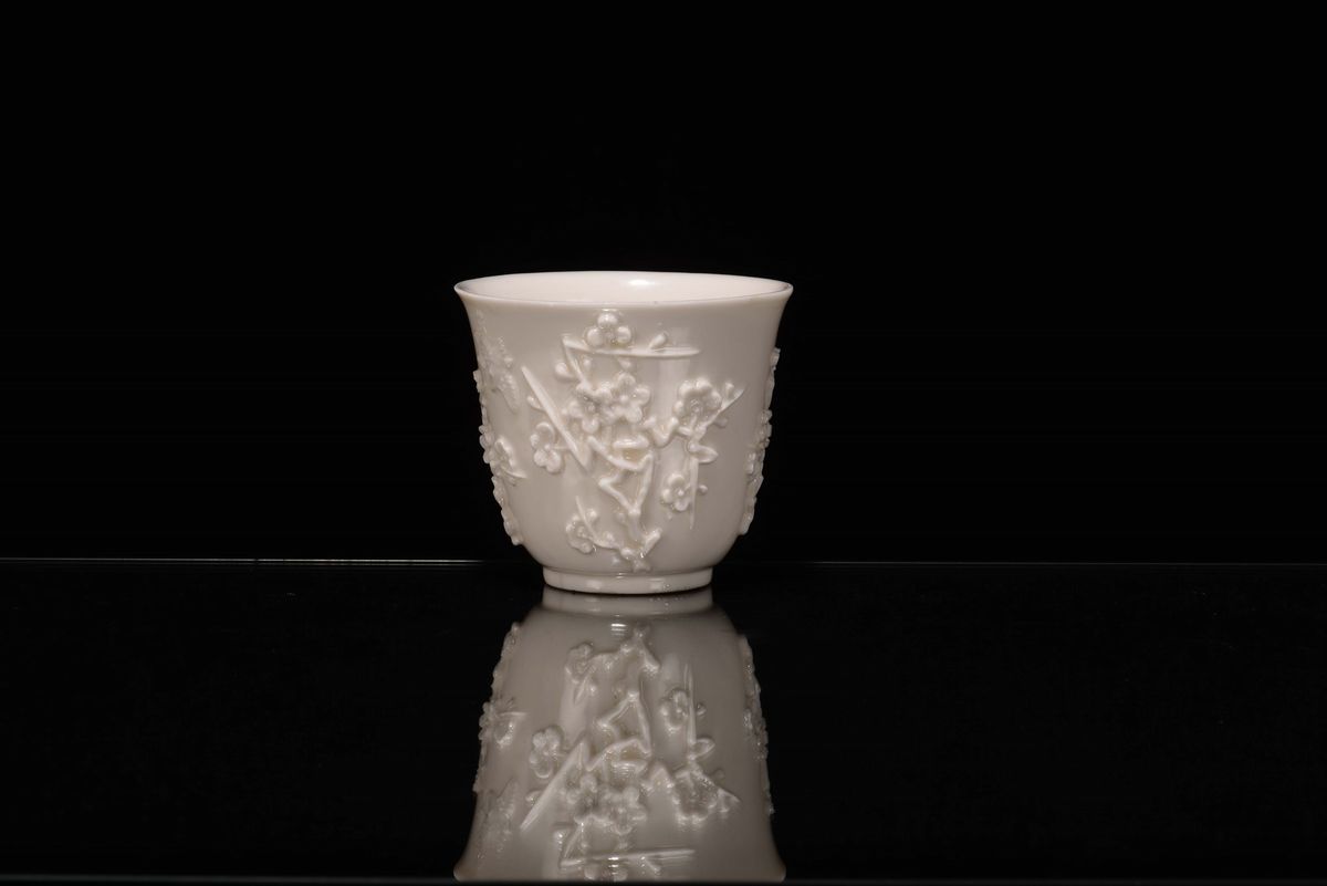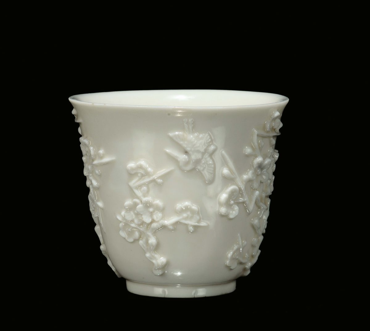 A Blanc de Chine porcelain libation cup with relief prune flowers, Dehua, China, Qing Dynasty, late 17th century