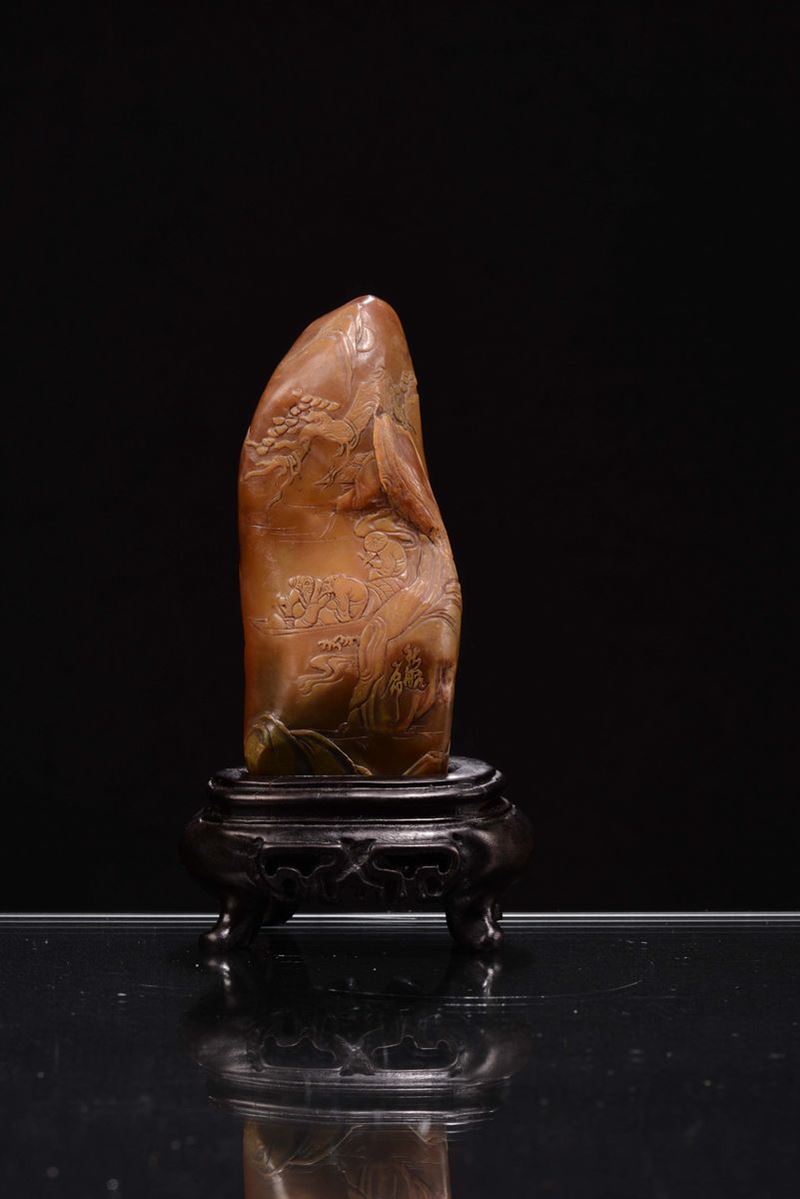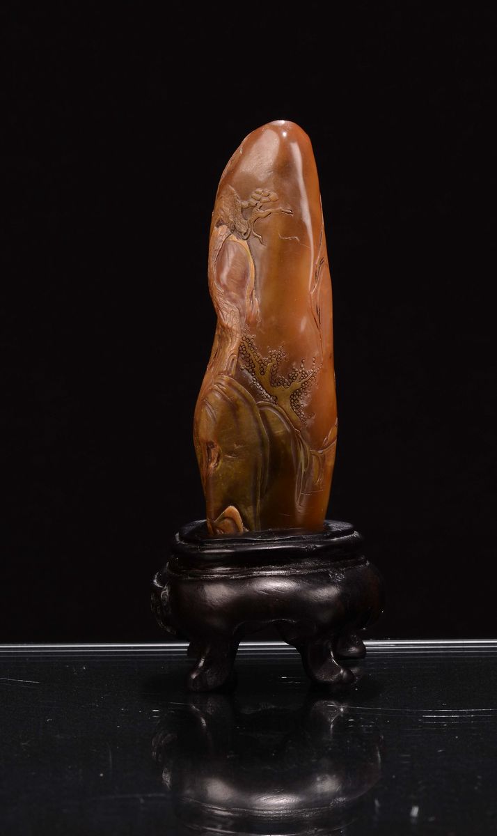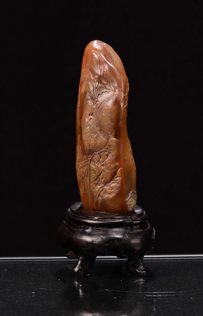 A carnelian agate mountain with landscapes, figures and inscriptions, China, Qing Dynasty, 19th century