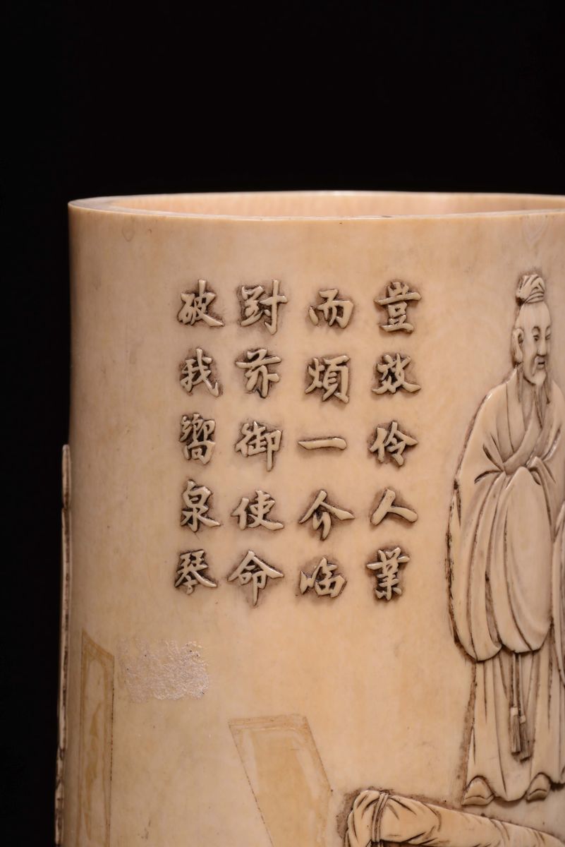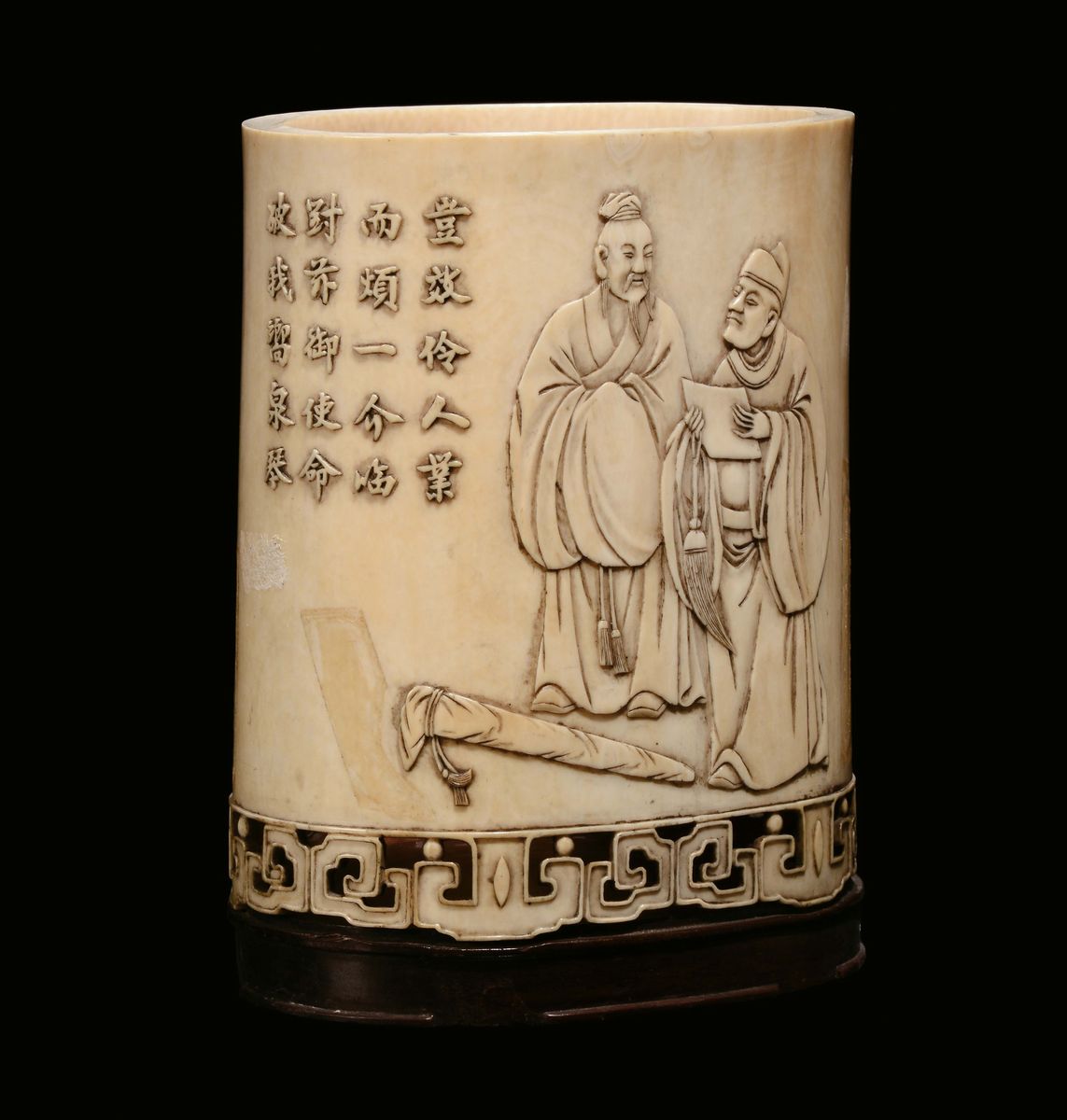 A carved bas-relief ivory brush-holder with oriental figures, China, Qing Dynasty, 19th century