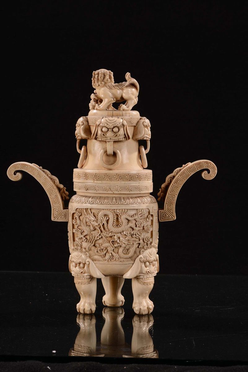 A carved ivory censer and “dragons” cover, China, Canton, 18th century