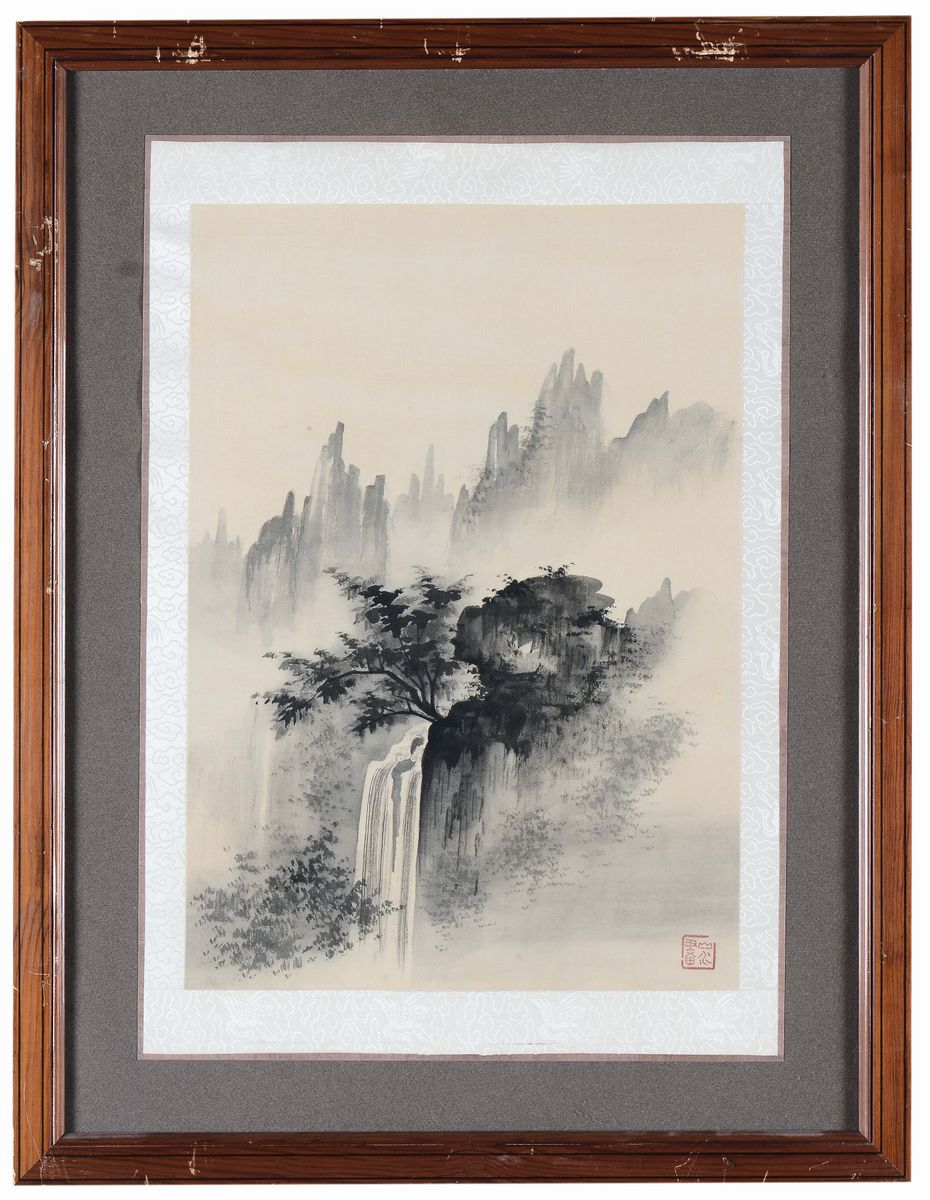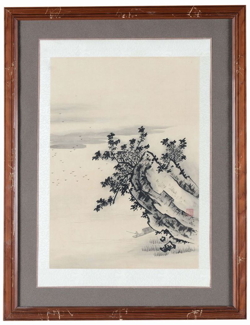 A lot of four prints on silk representing landscapes, China, Republic, 20th century