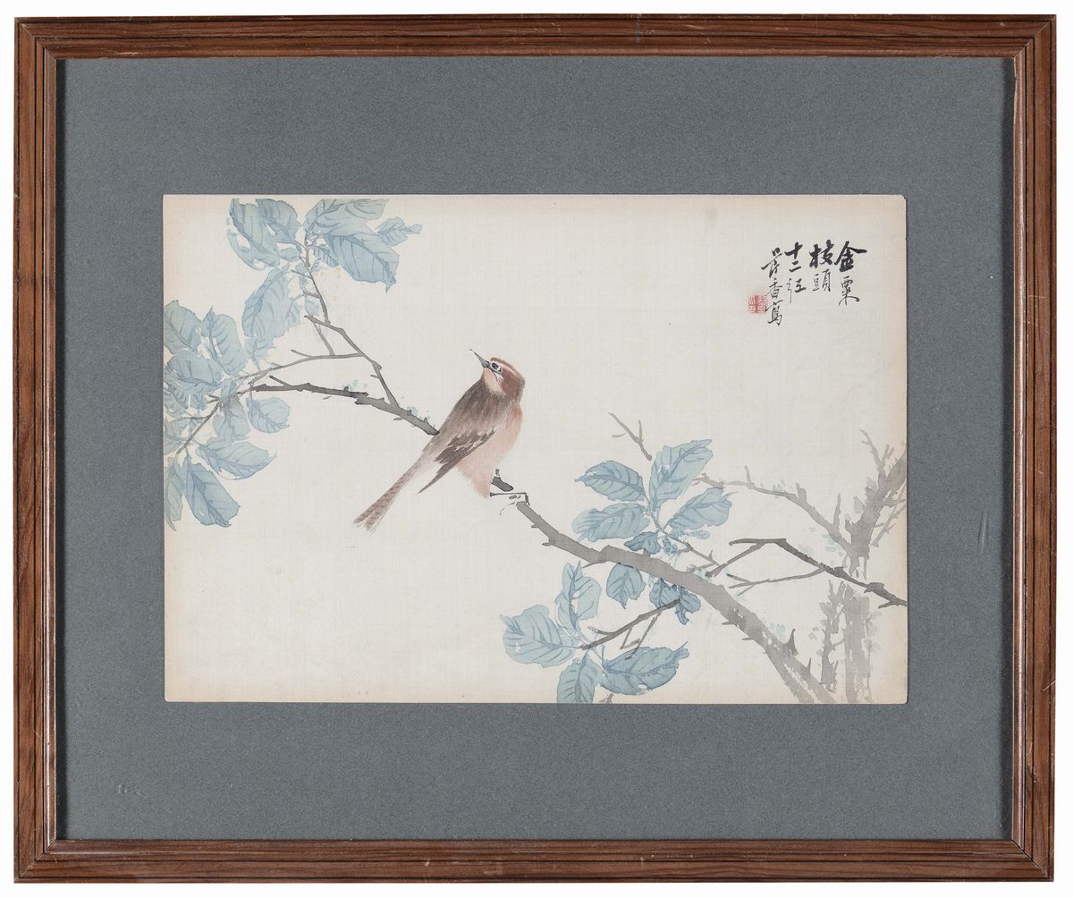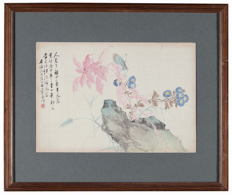 A lot of three watercolours on silk representing flowers with animals, signed, China, Republic, 20th century