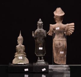 A lot of two bronze statuettes and a sandstone one, Thailand, 17th century