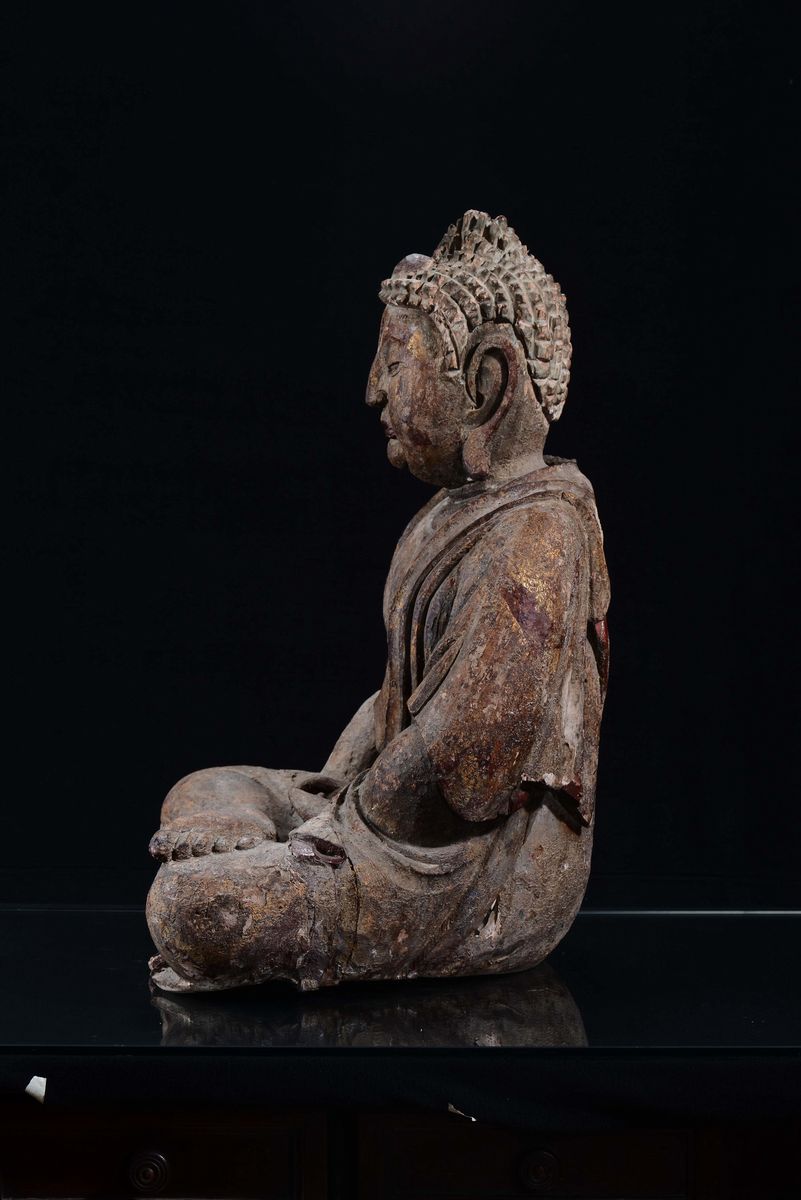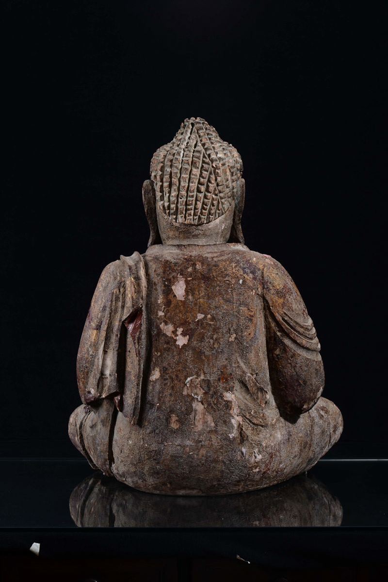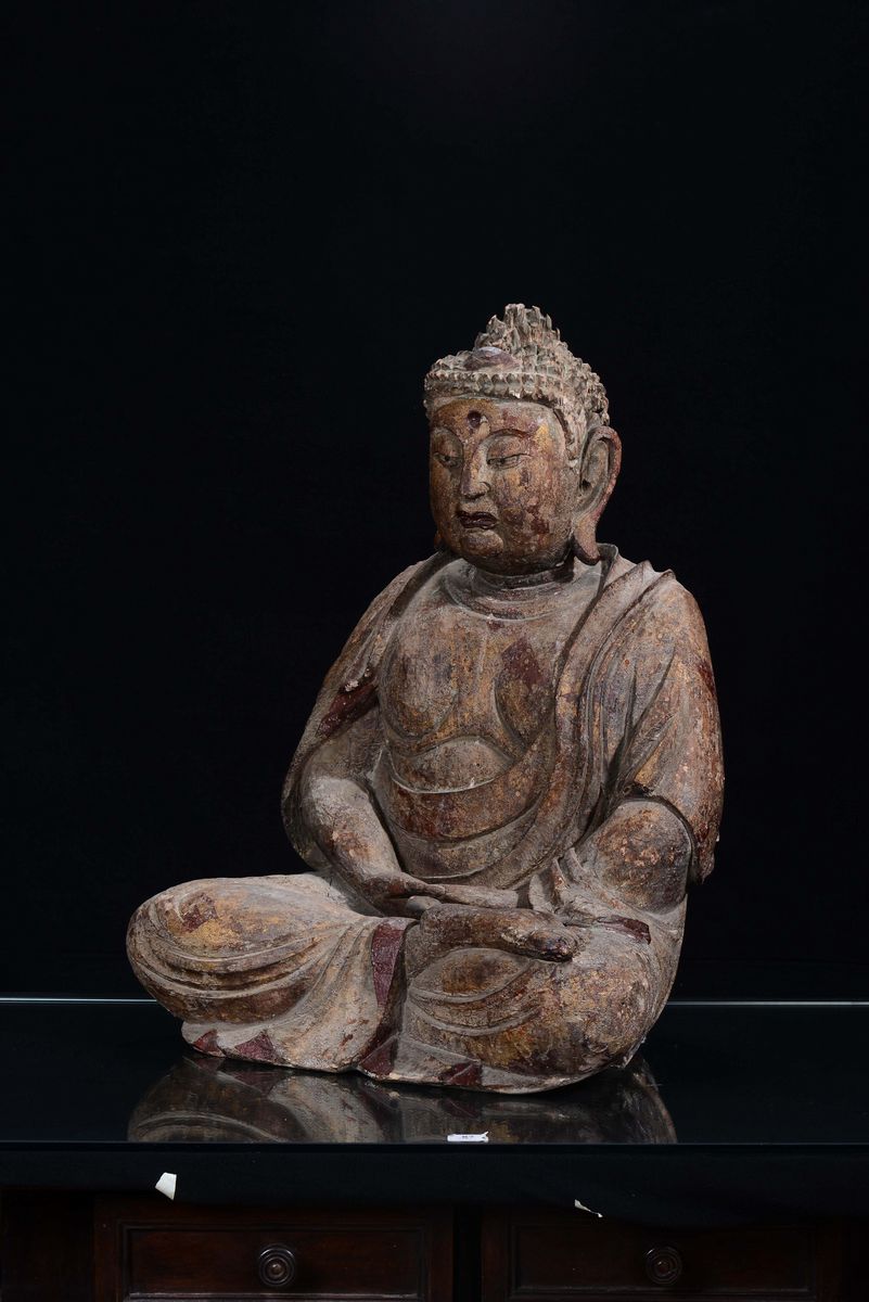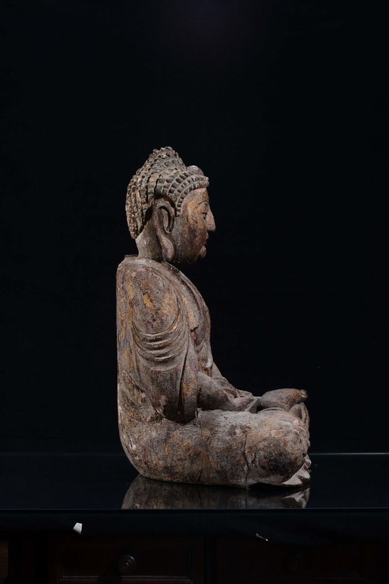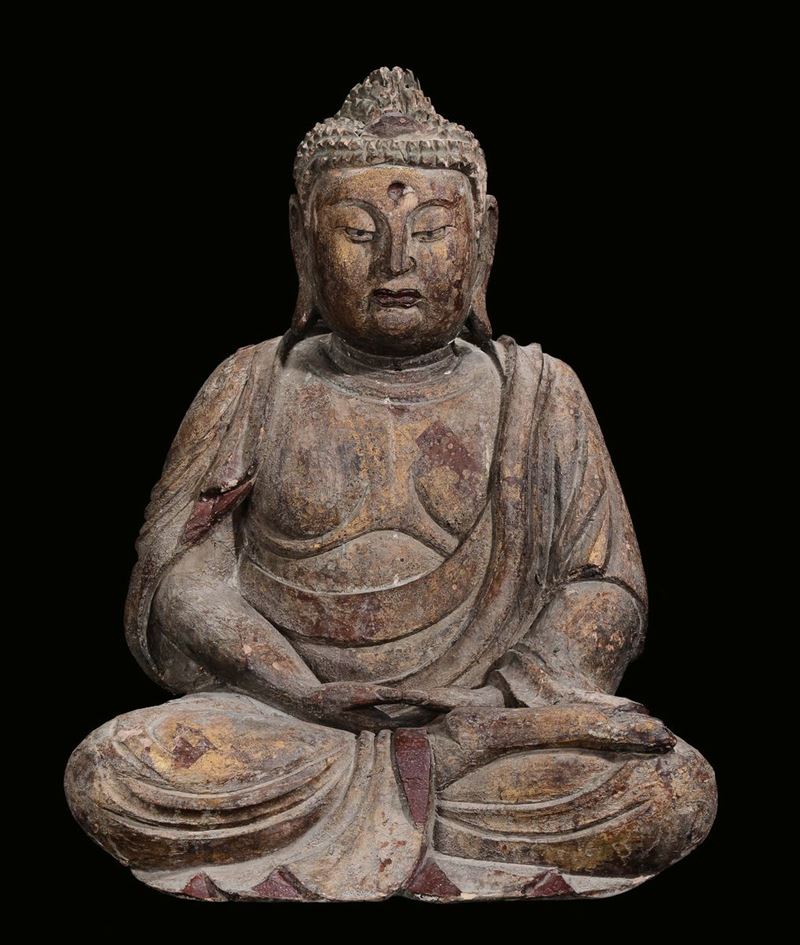 A monochrome carved wood sitting Buddha, China, Ming Dynasty, 17th century