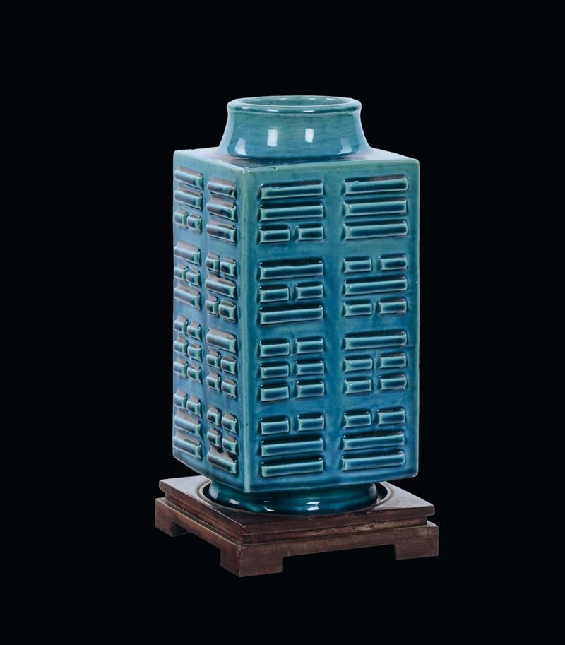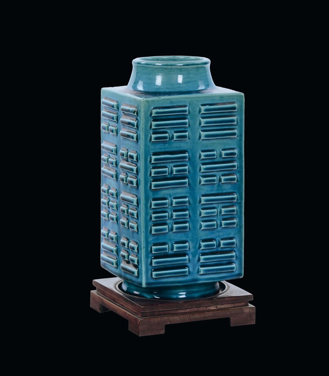 A monochrome turquoise square-section porcelain Kong vase, China, Qing Dynasty, 19th century