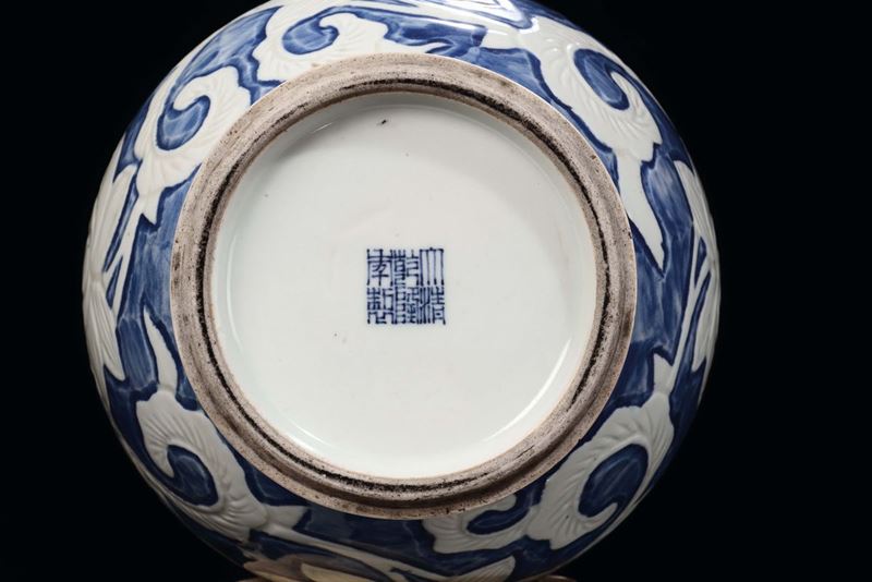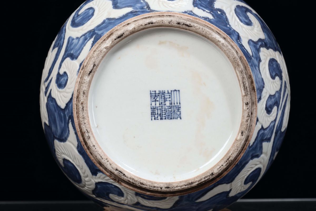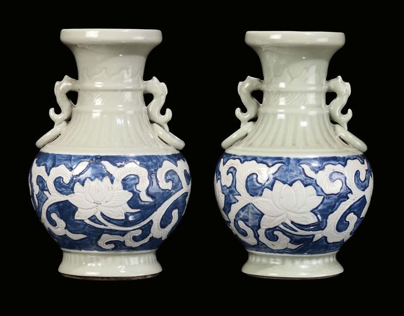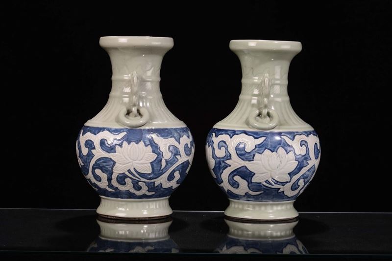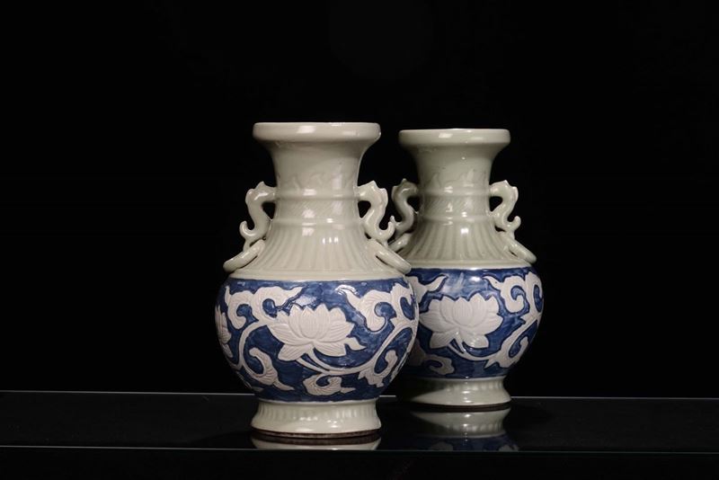 A pair of Celadon porcelain and light-blue enamels vases, apocryphal Quianlong mark, China, Qing Dynasty, 19th century