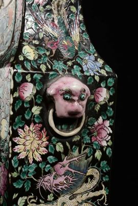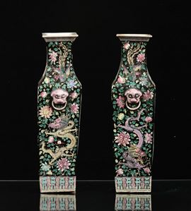 A pair of Famille-Noire porcelain vases, square-section decorated with floral motives and animals, China, Qing Dynasty, [..]