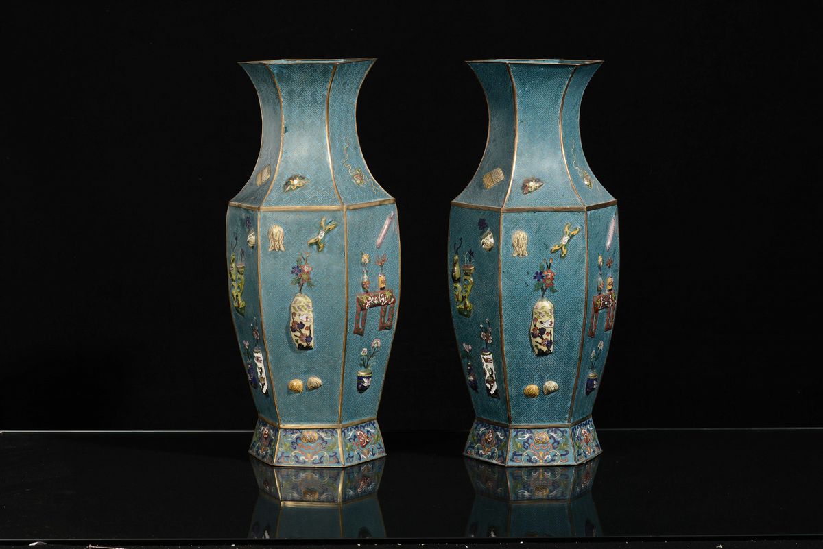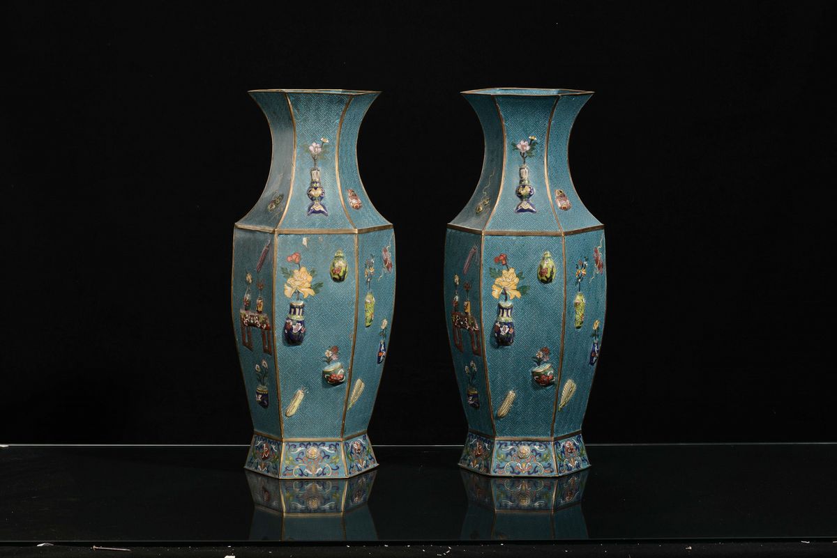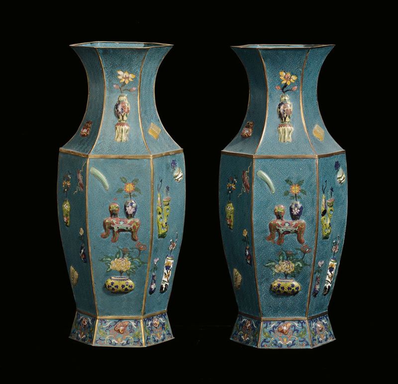 A pair of hexagonal-section cloisonné vases, China, Qing Dynasty, 19th century