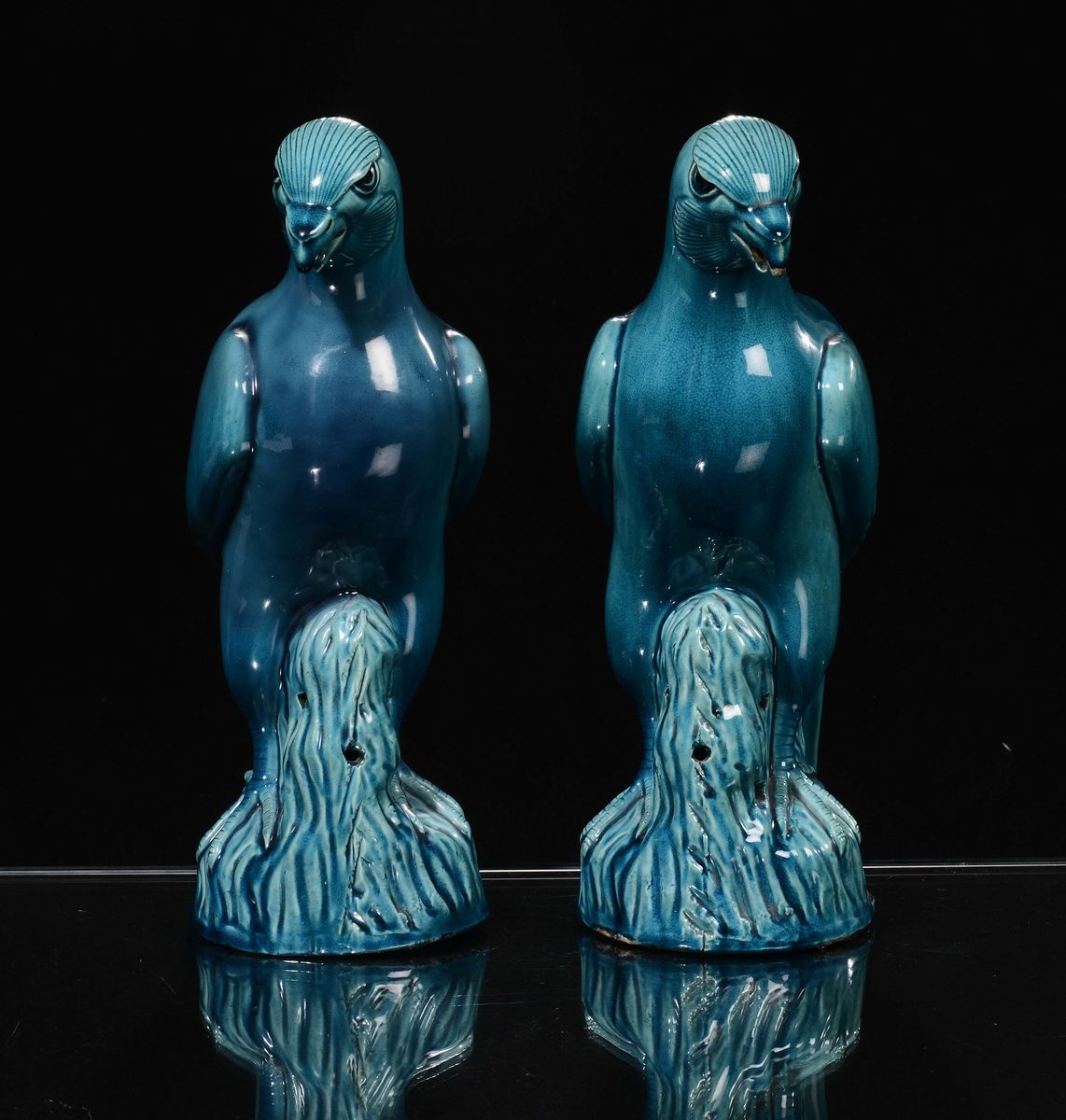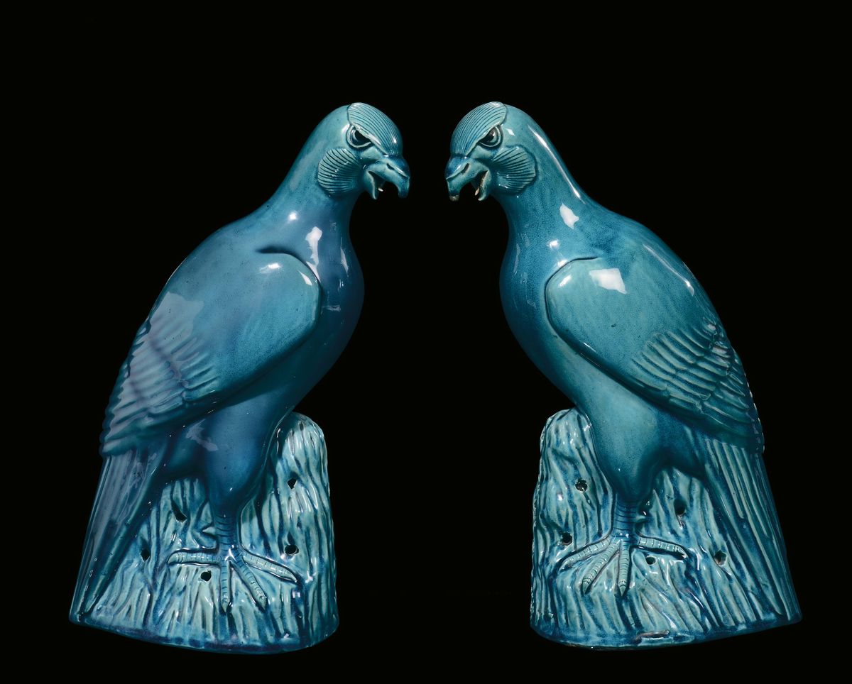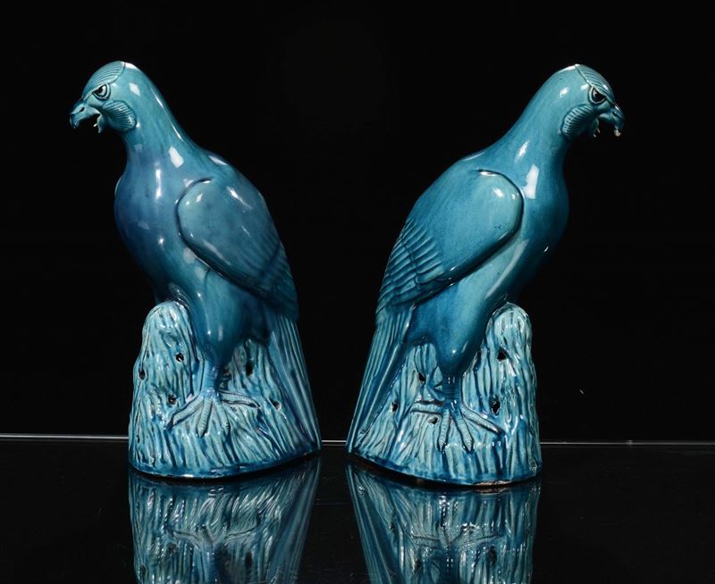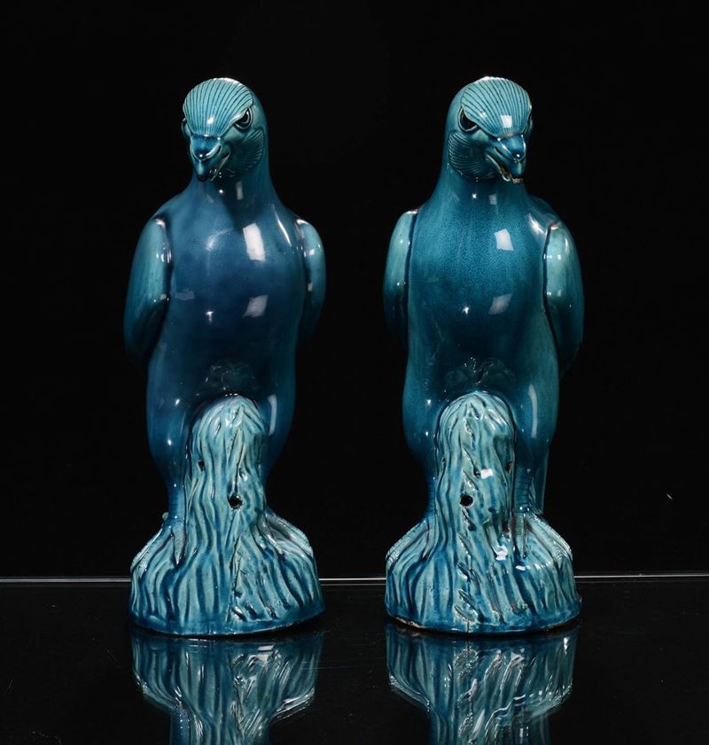 A pair of monochrome turquoise porcelain birds, China, Qing Dynasty, 18th century