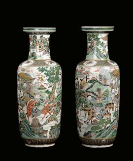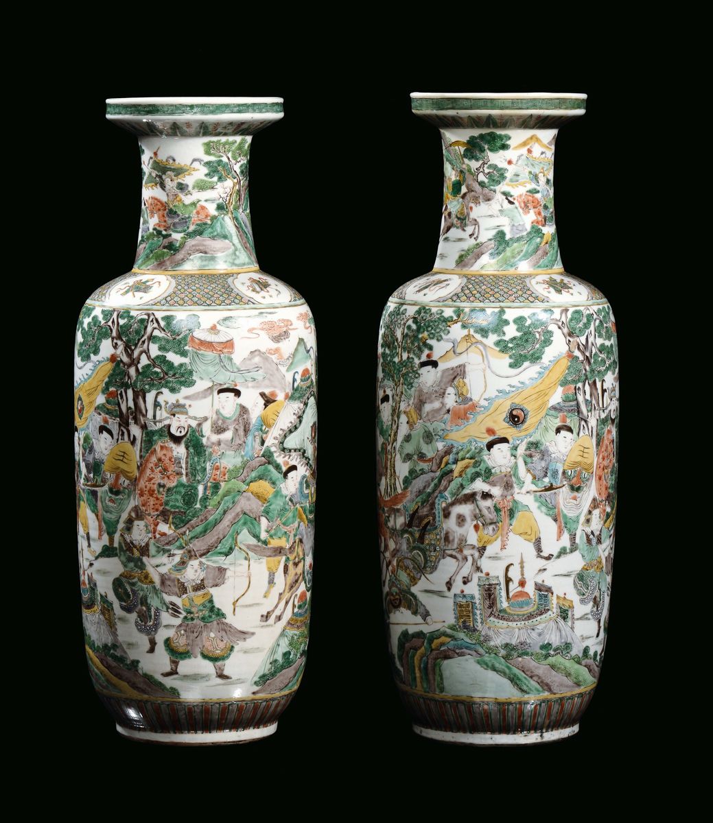 A pair of polychrome Famille-Verte porcelain ruleau vases with oriental figures, China, Qing Dynasty, late 19th century