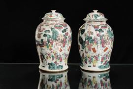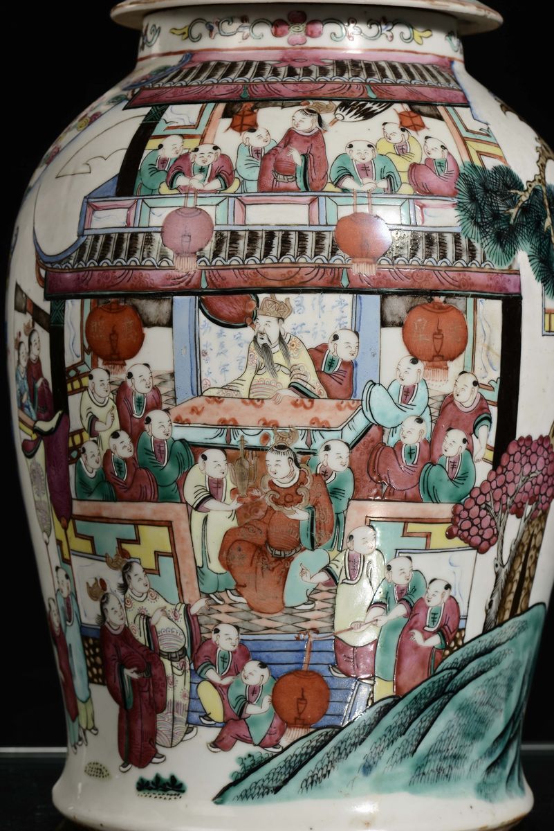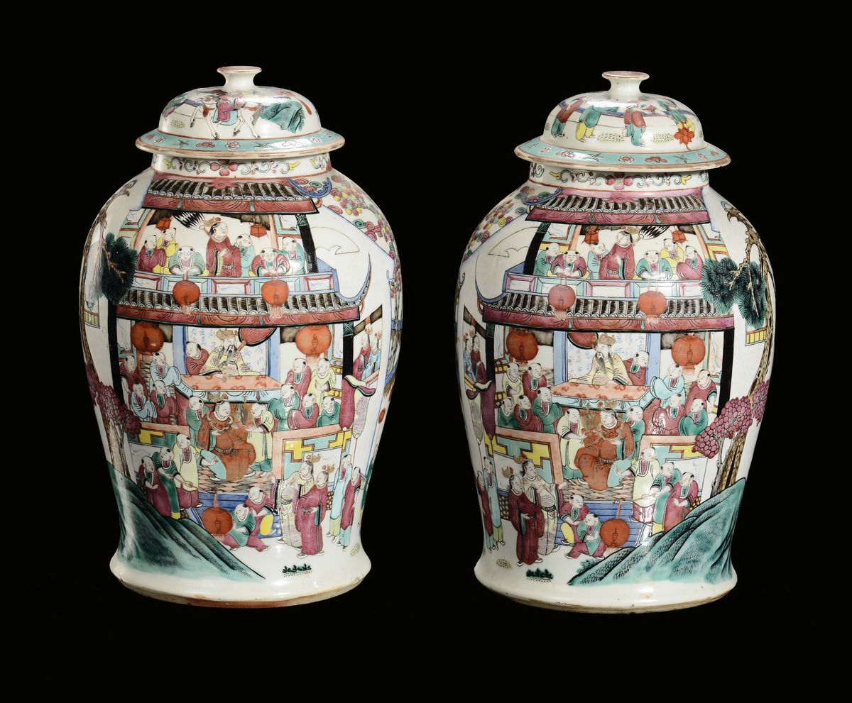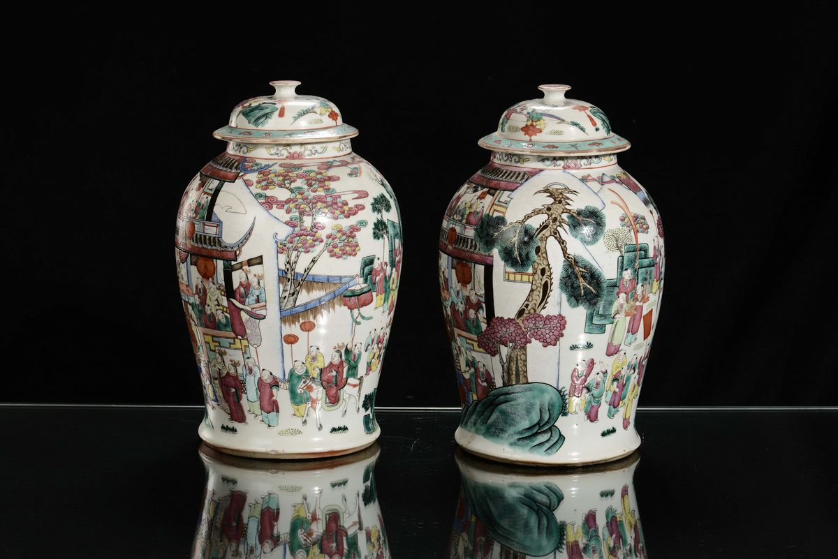 A pair of polychrome porcelain potiches decorated with oriental life scenes, China, Qing Dynasty, 19th century