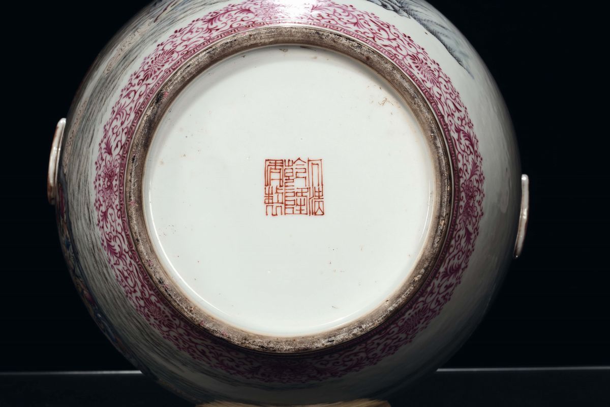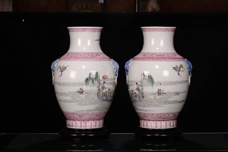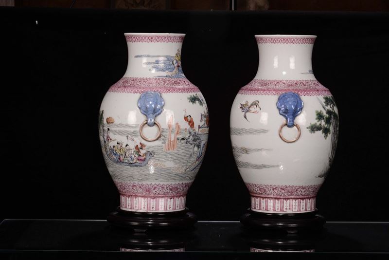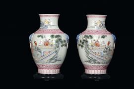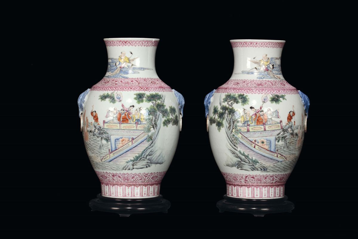 A pair of polychrome porcelain vases with oriental scenes and figures, China, Republic, 20th century