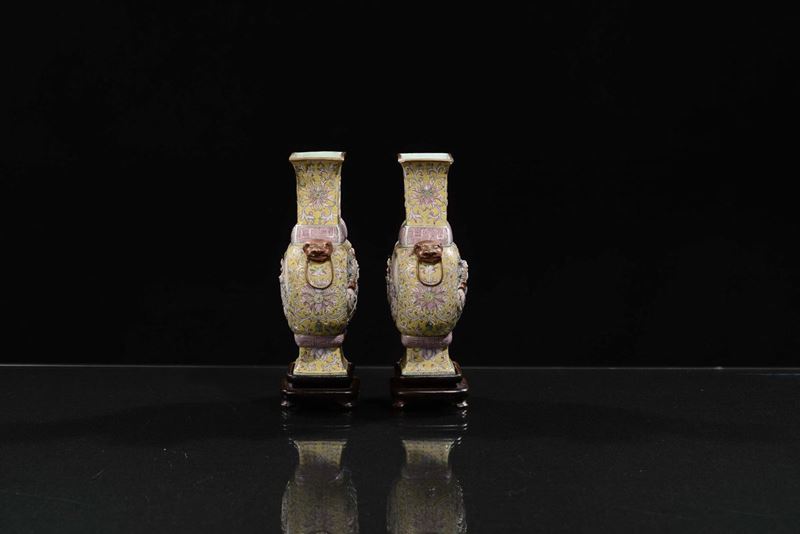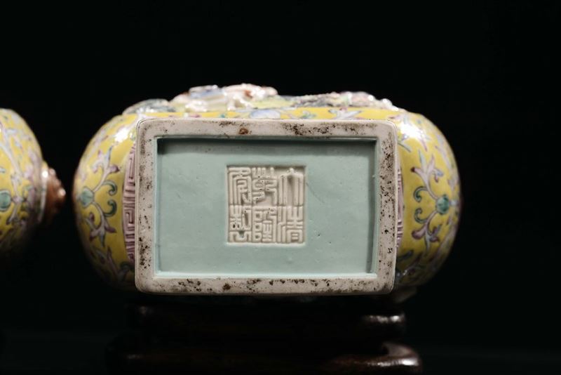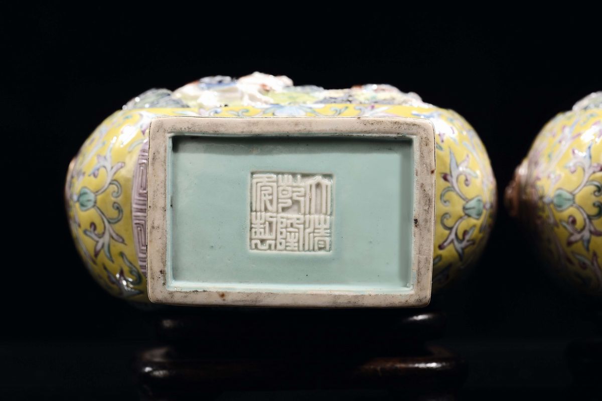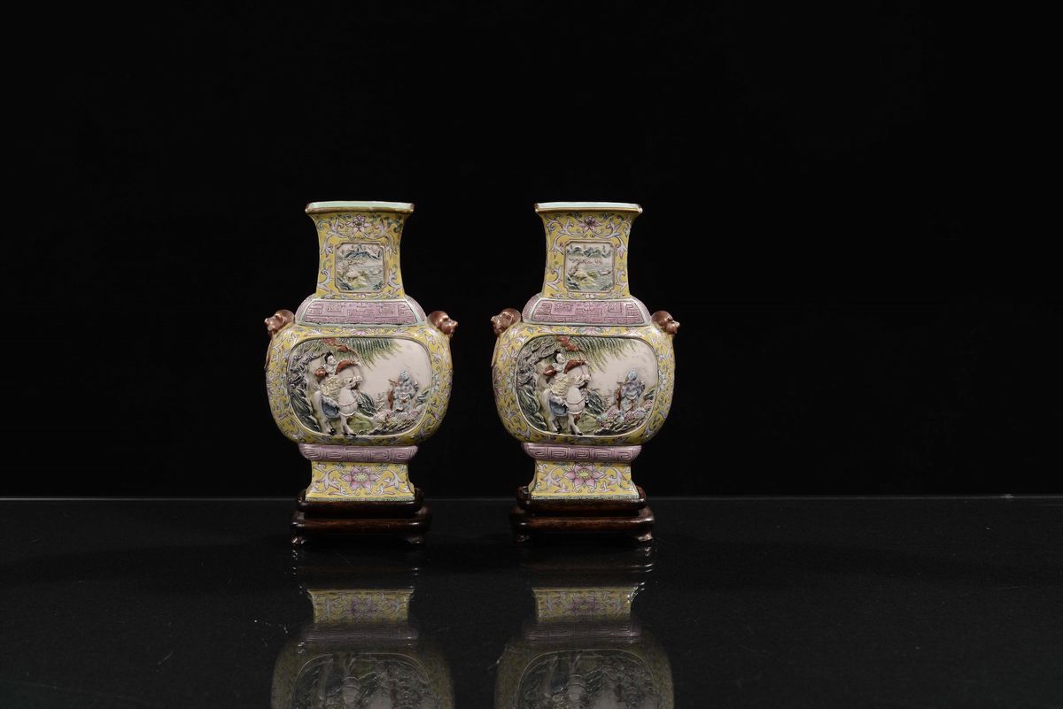 A pair of polychrome porcelain vases with relief figures, China, Republic, 20th century