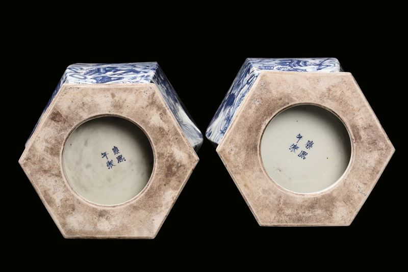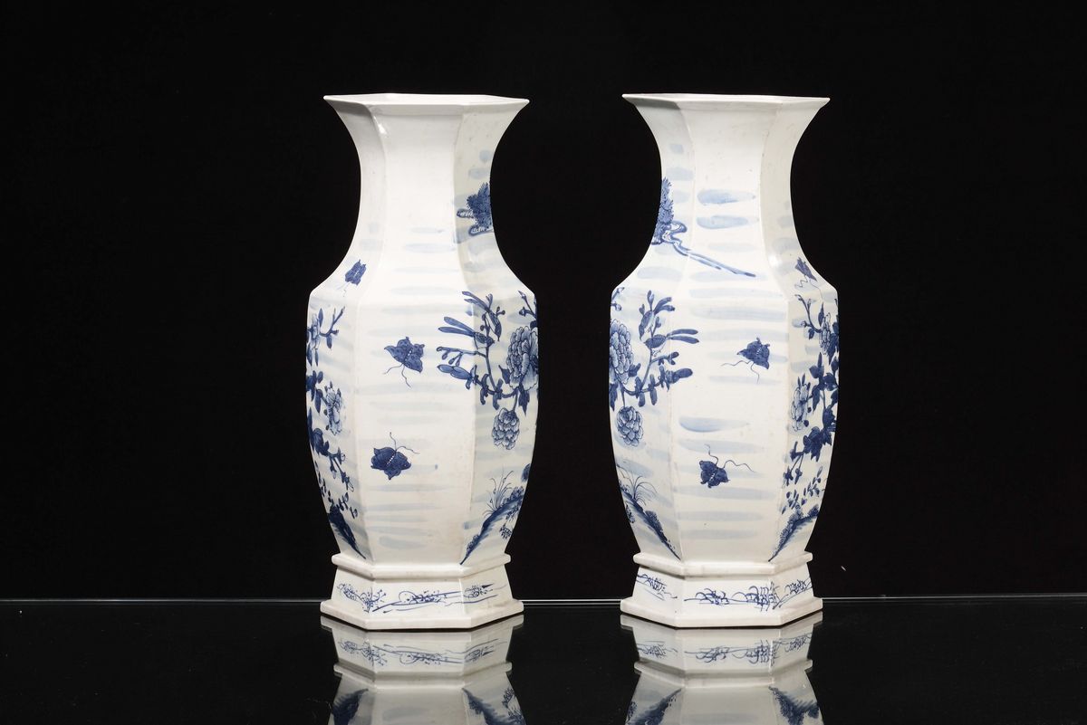 A pair of white and blue porcelain hexagonal-section vases with floral decoration, China, Republic, 20th century
