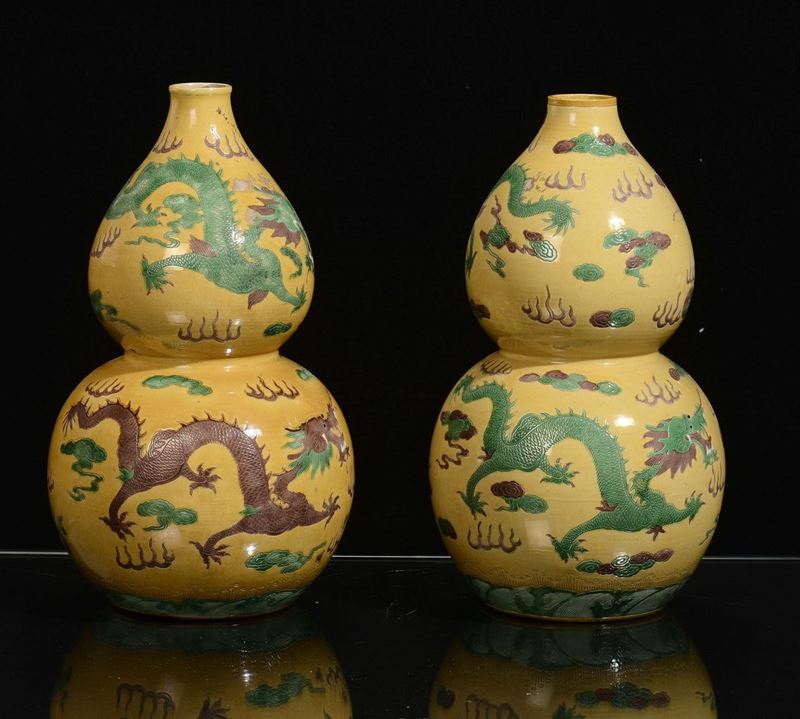 A pair of yellow background “pumpkin” vases, China, Republic, 20th century