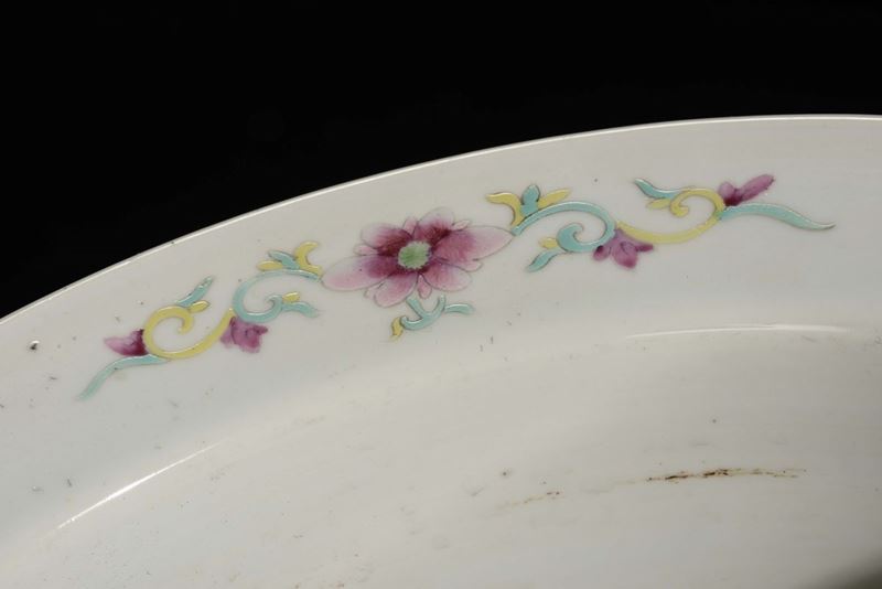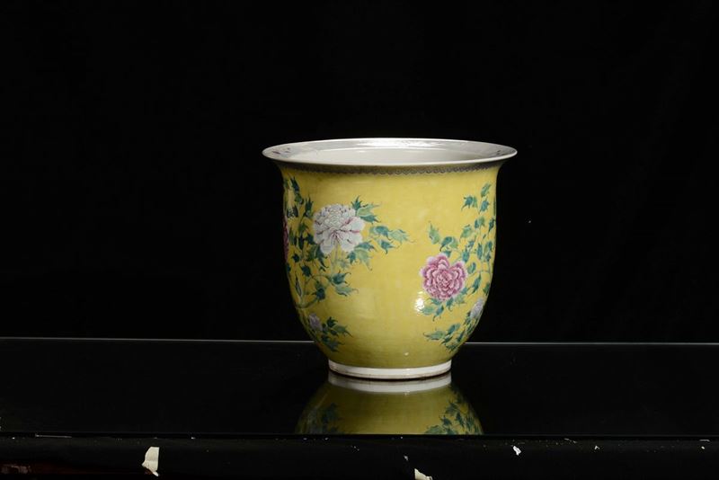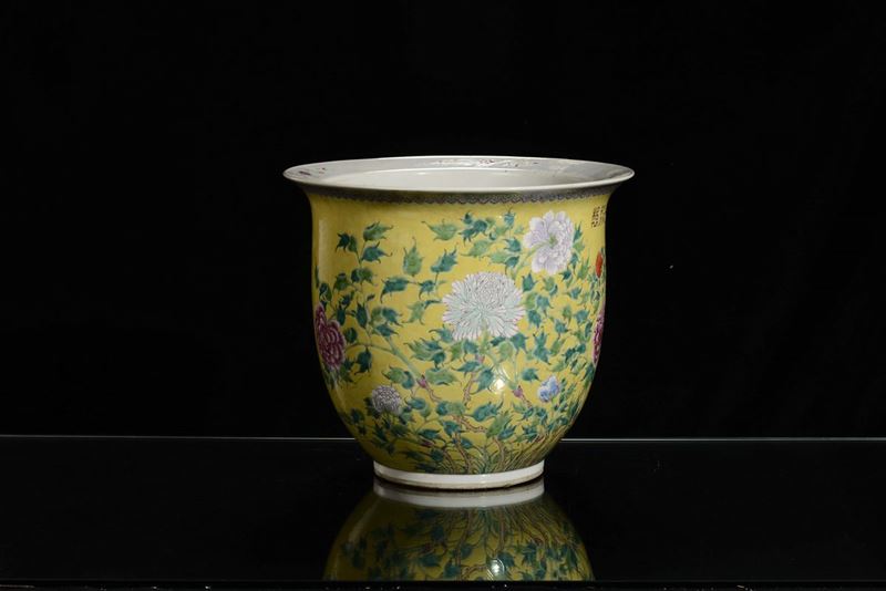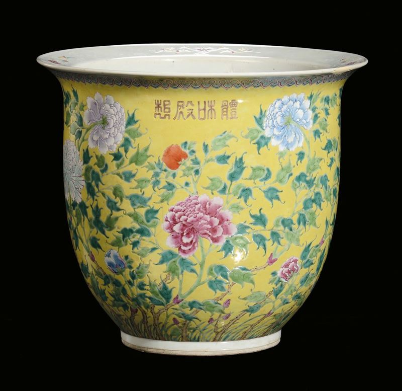 A polychrome porcelain Cachepot with floral decoration on yellow background and ideograms, China, Qing Dynasty 19th centu [..]