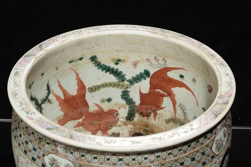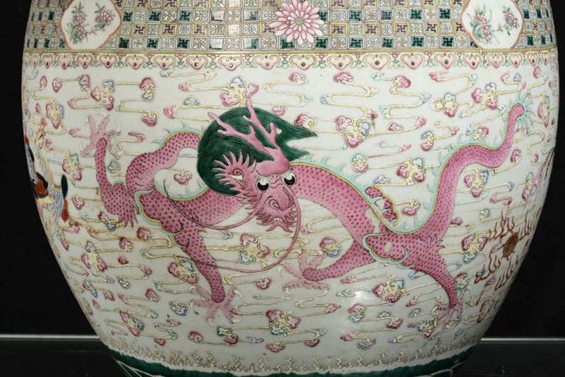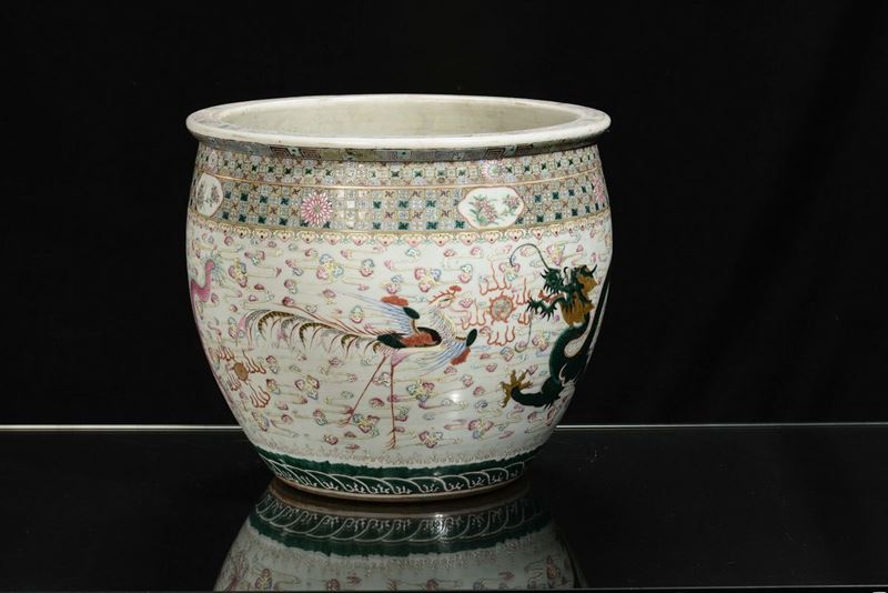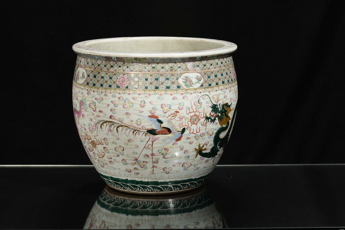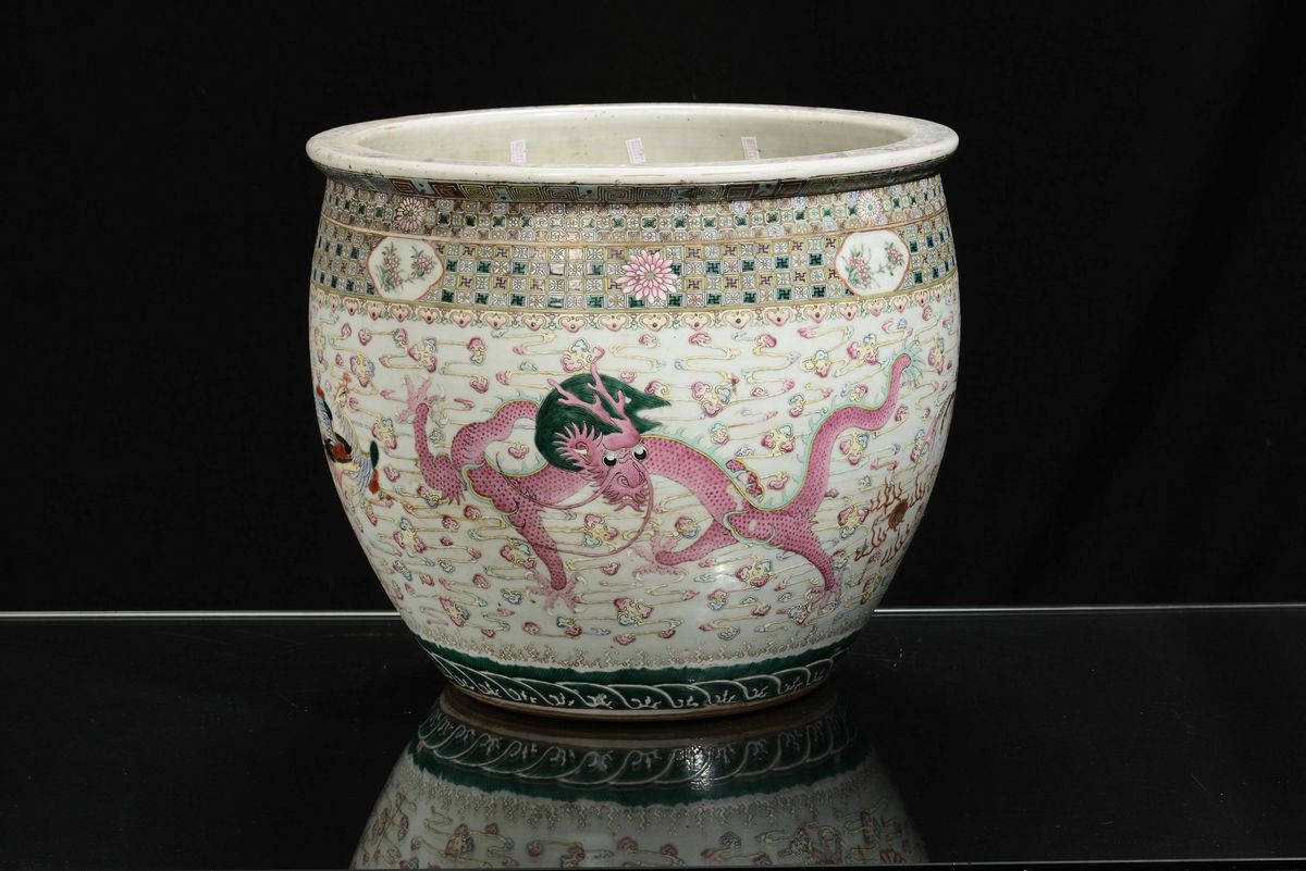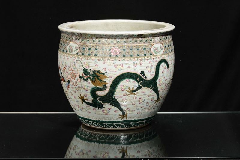 A polychrome porcelain Cachepot with floral decoration and dragons, China, Qing Dynasty, 19th century