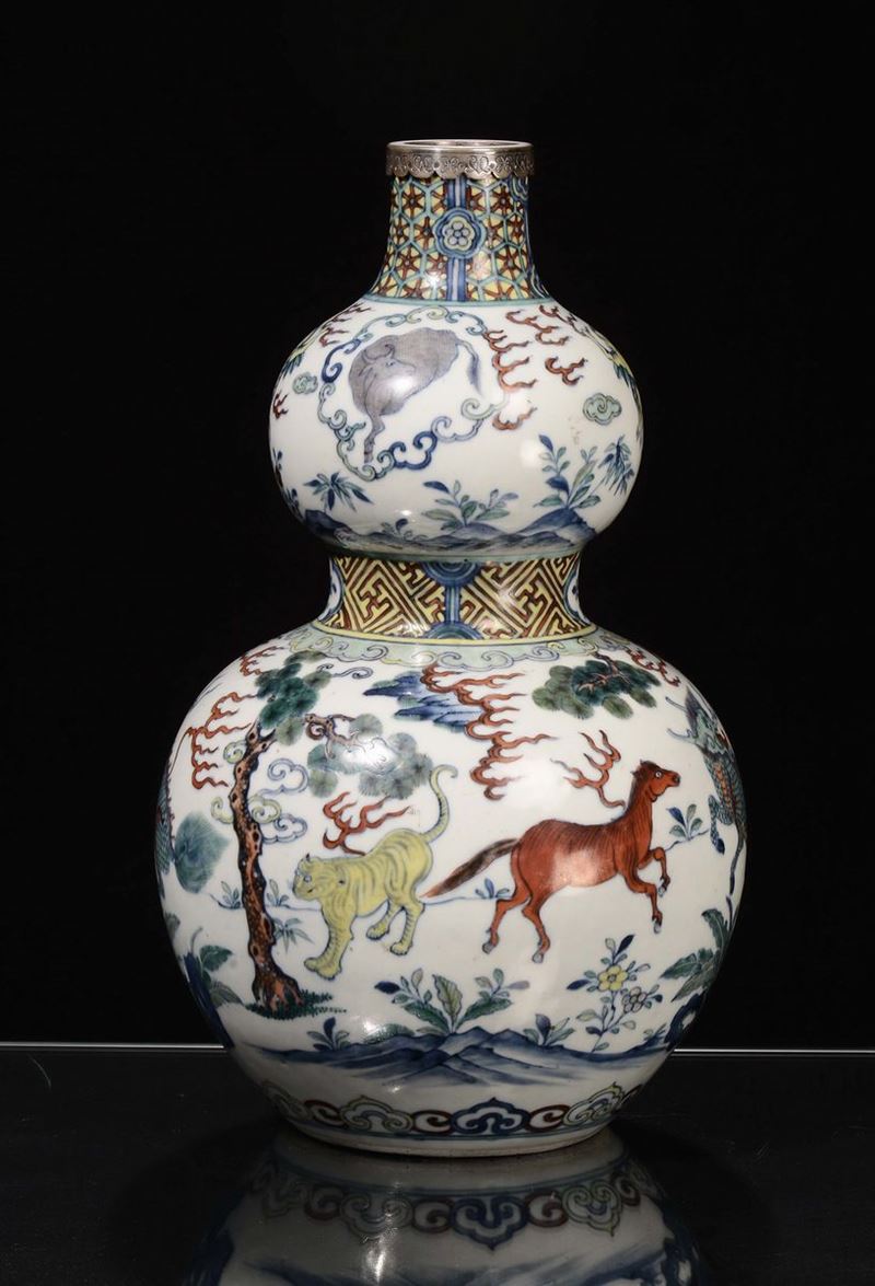 A porcelain Ducai “double pear” vase with imaginary animals, China, 17th century