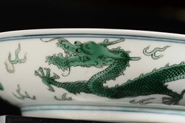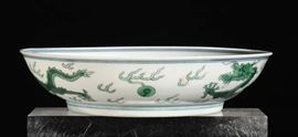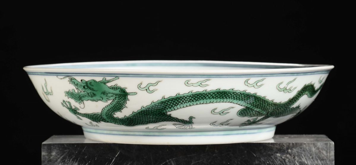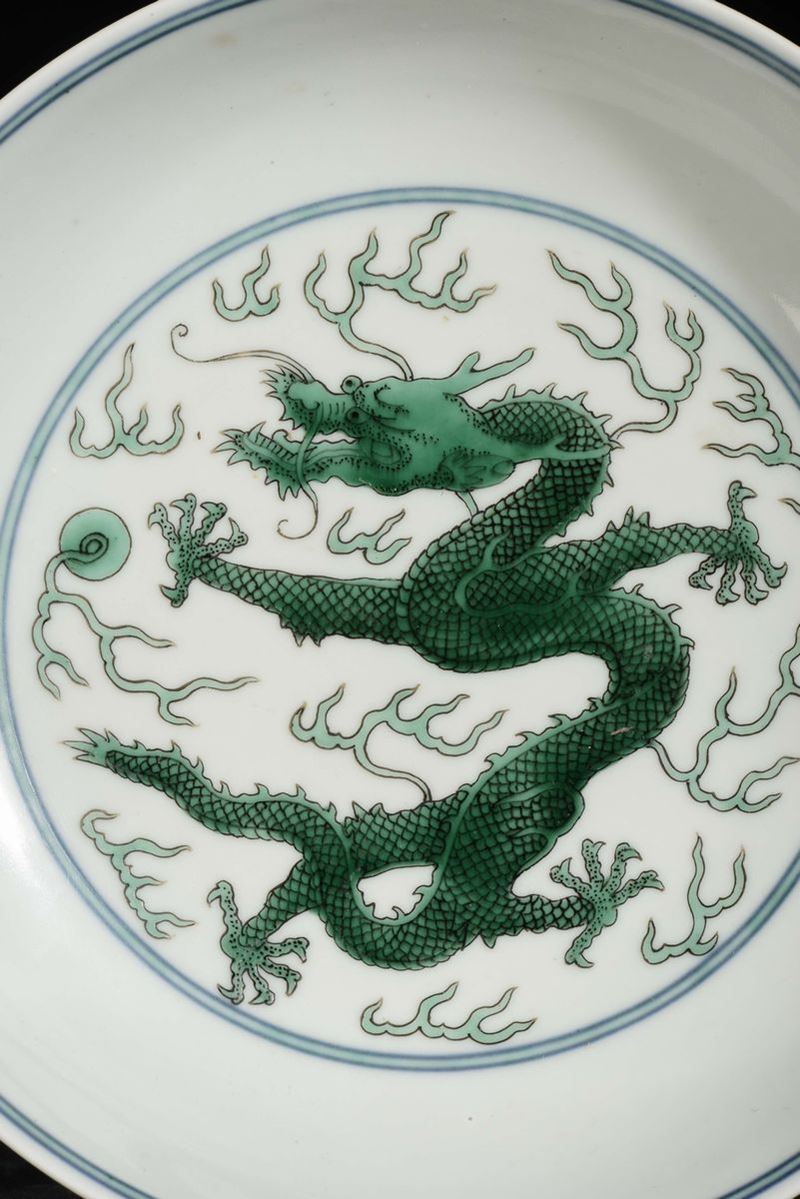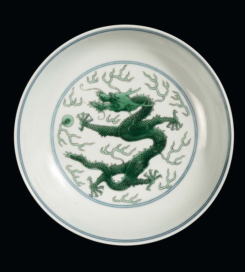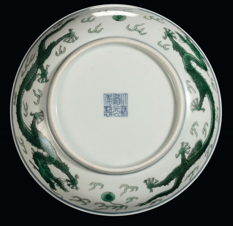 A porcelain green enamel dish with dragon, China, Qing Dynasty, Daoguang (1821-1850) mark and the period