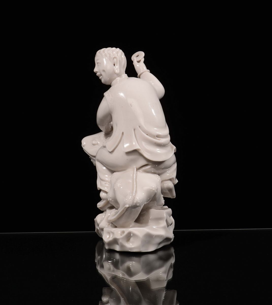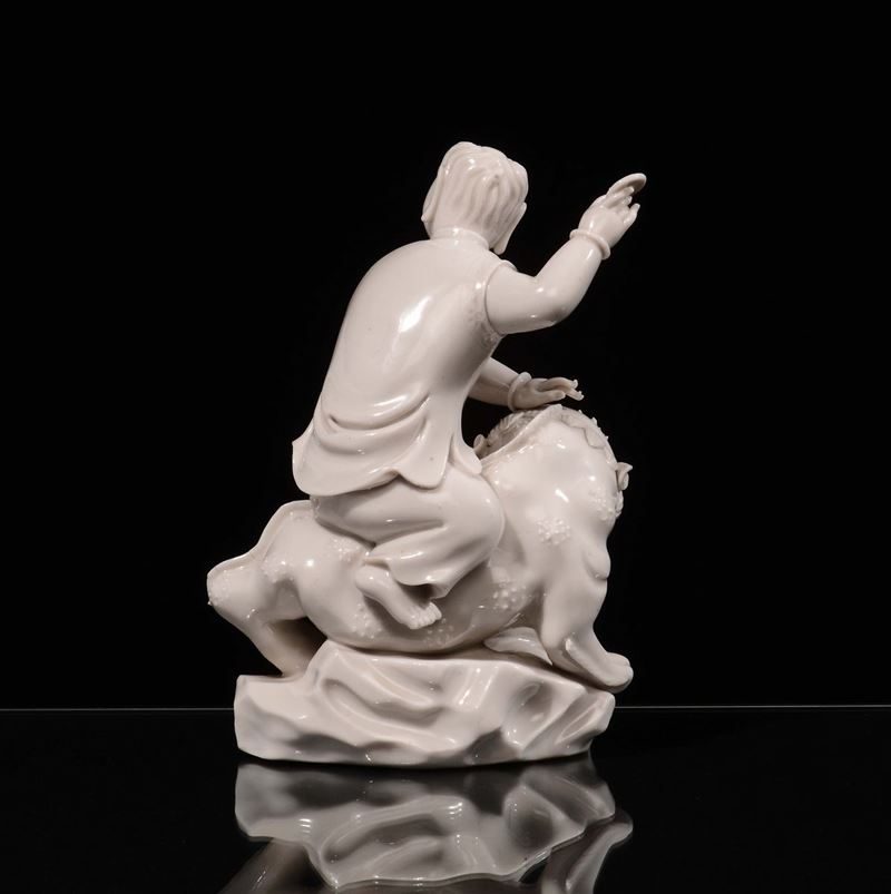 A rare Blanc de Chine porcelain o boy figure on an imaginary animal, Dehua, China, late 17th century