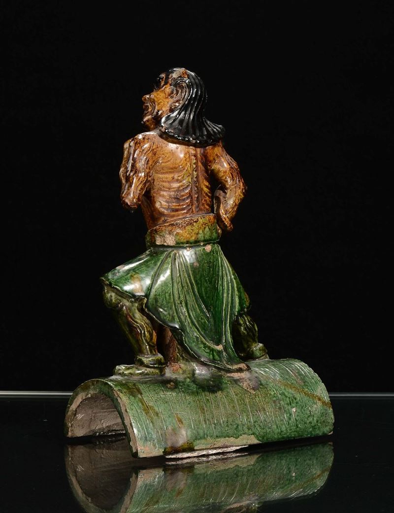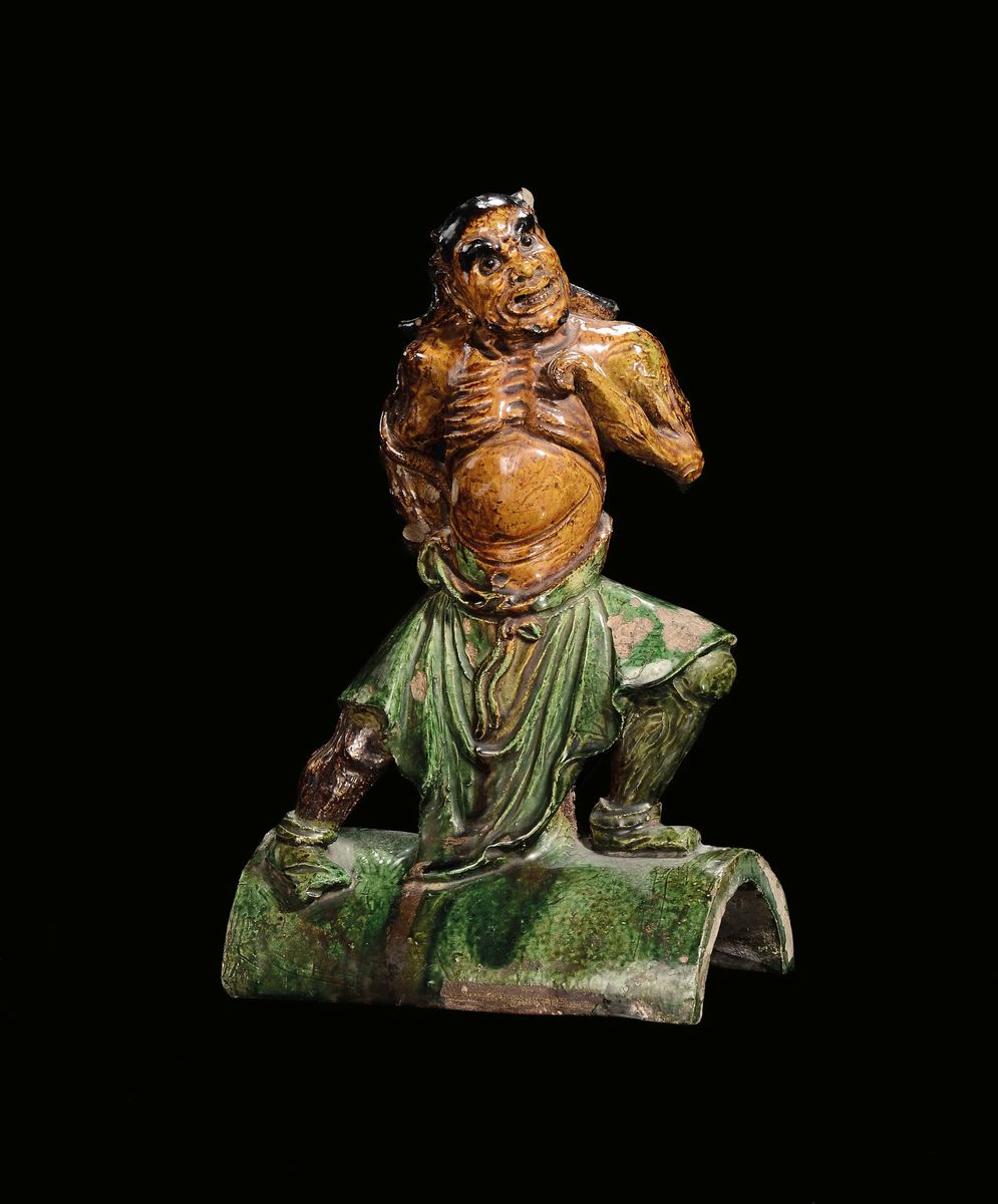 A rare stoneware “warrior” tile in green and yellow, China, Ming Dynasty, 17th century