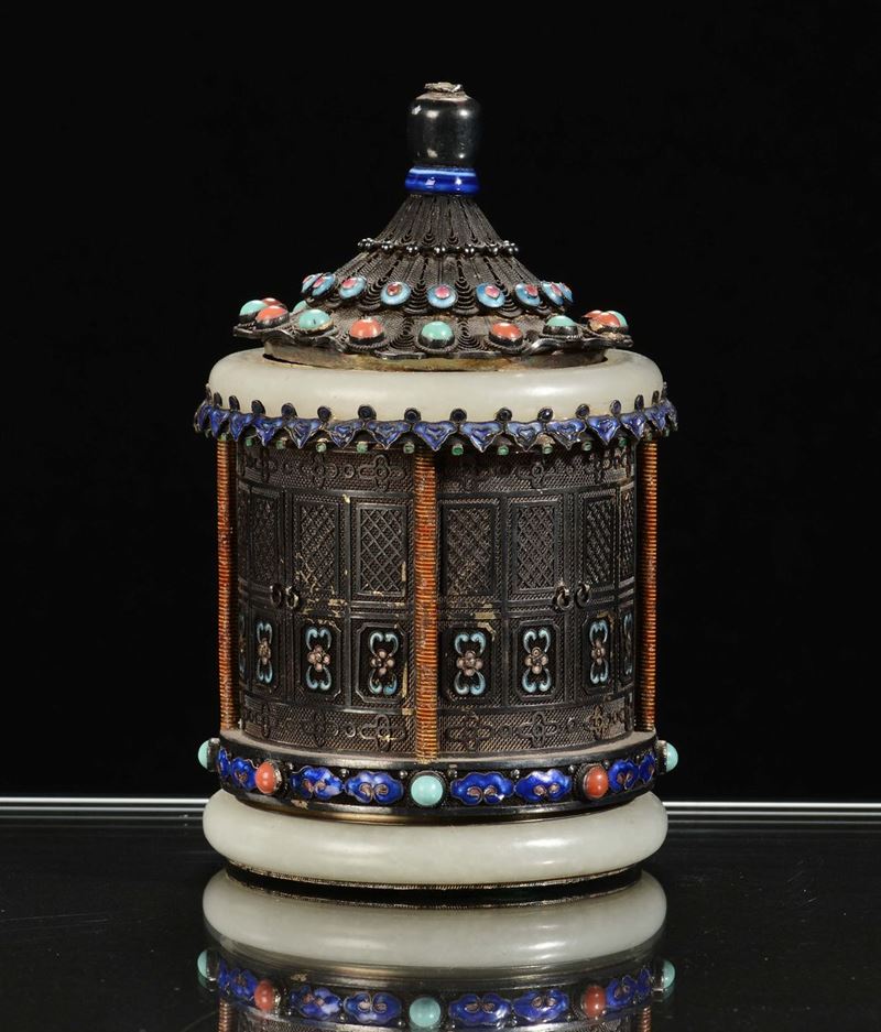 A silver “pagoda” box with jade, enamels and hard stone applications, China, Qing Dynasty, 19th century