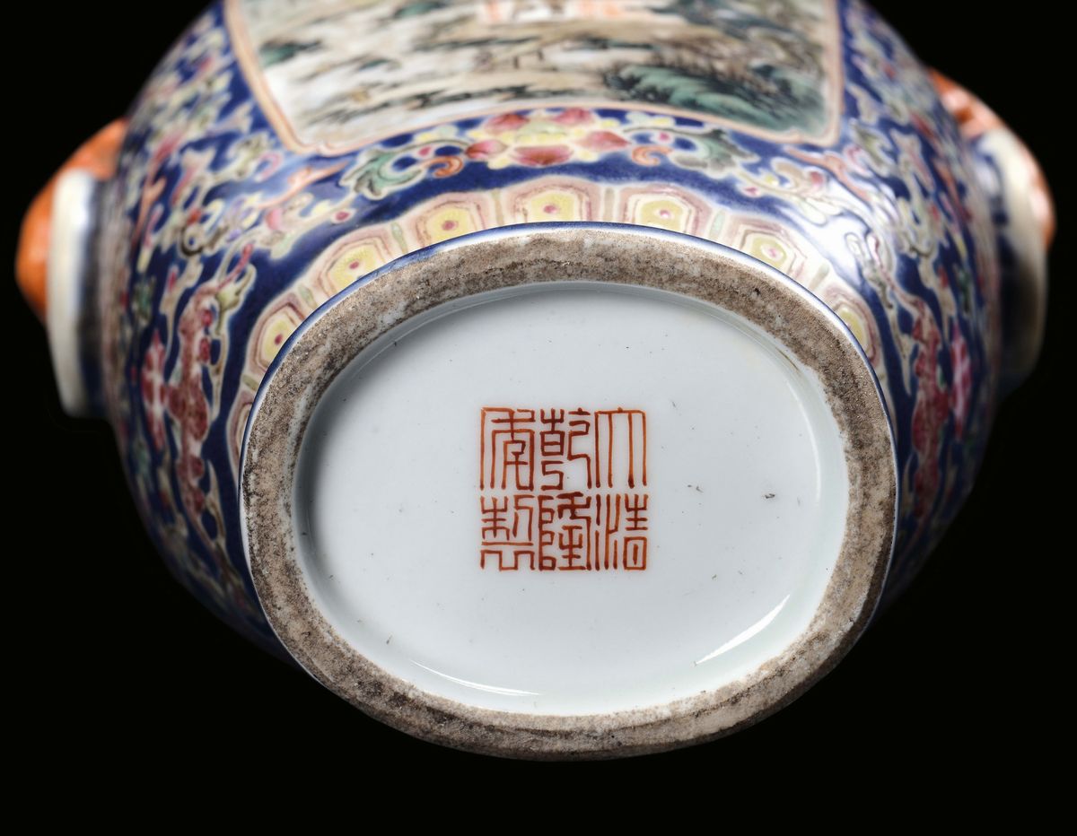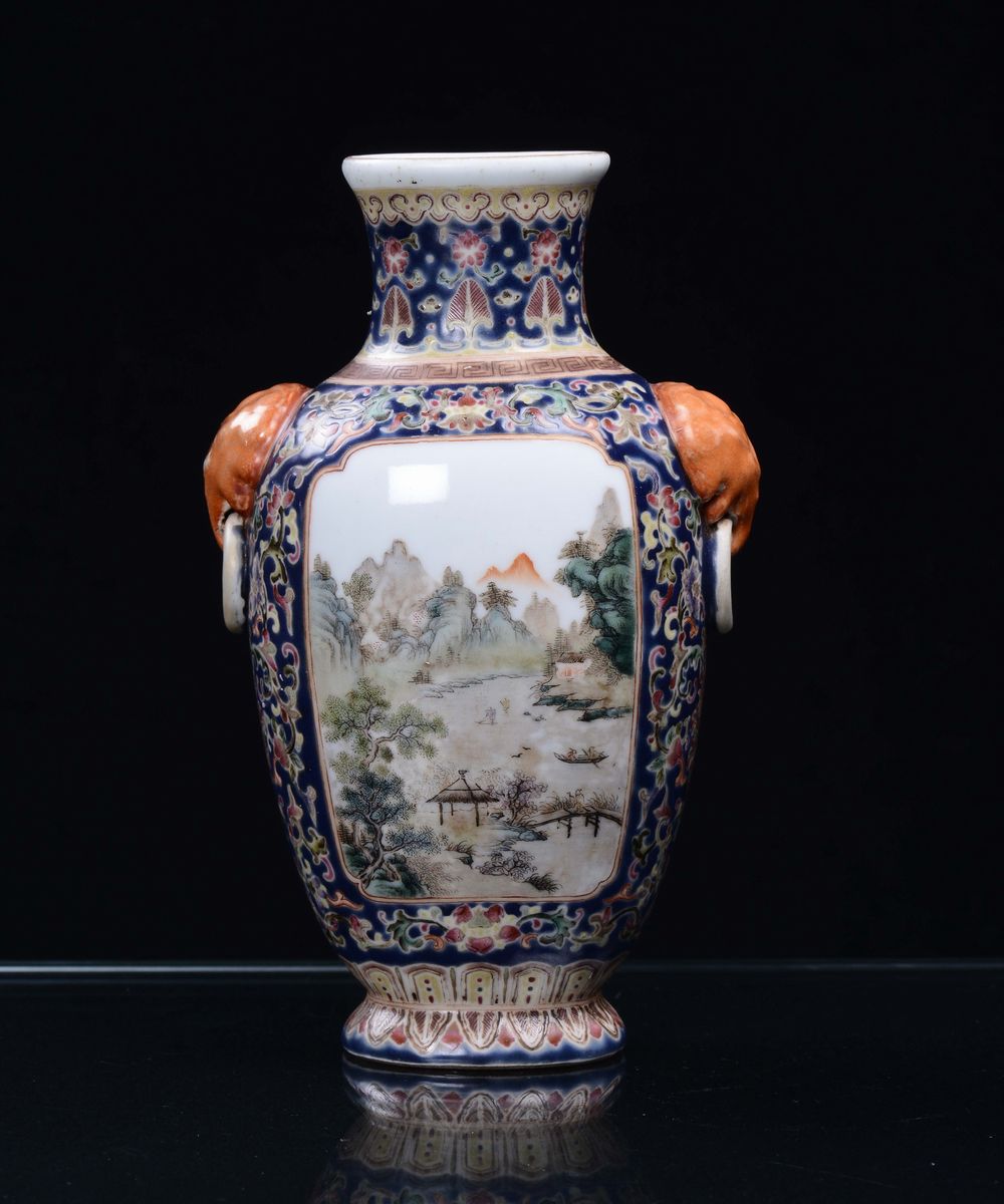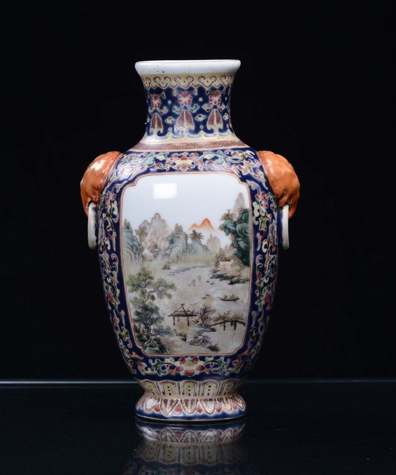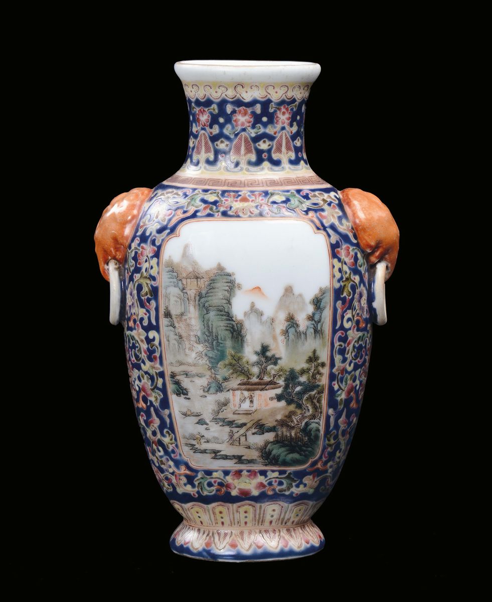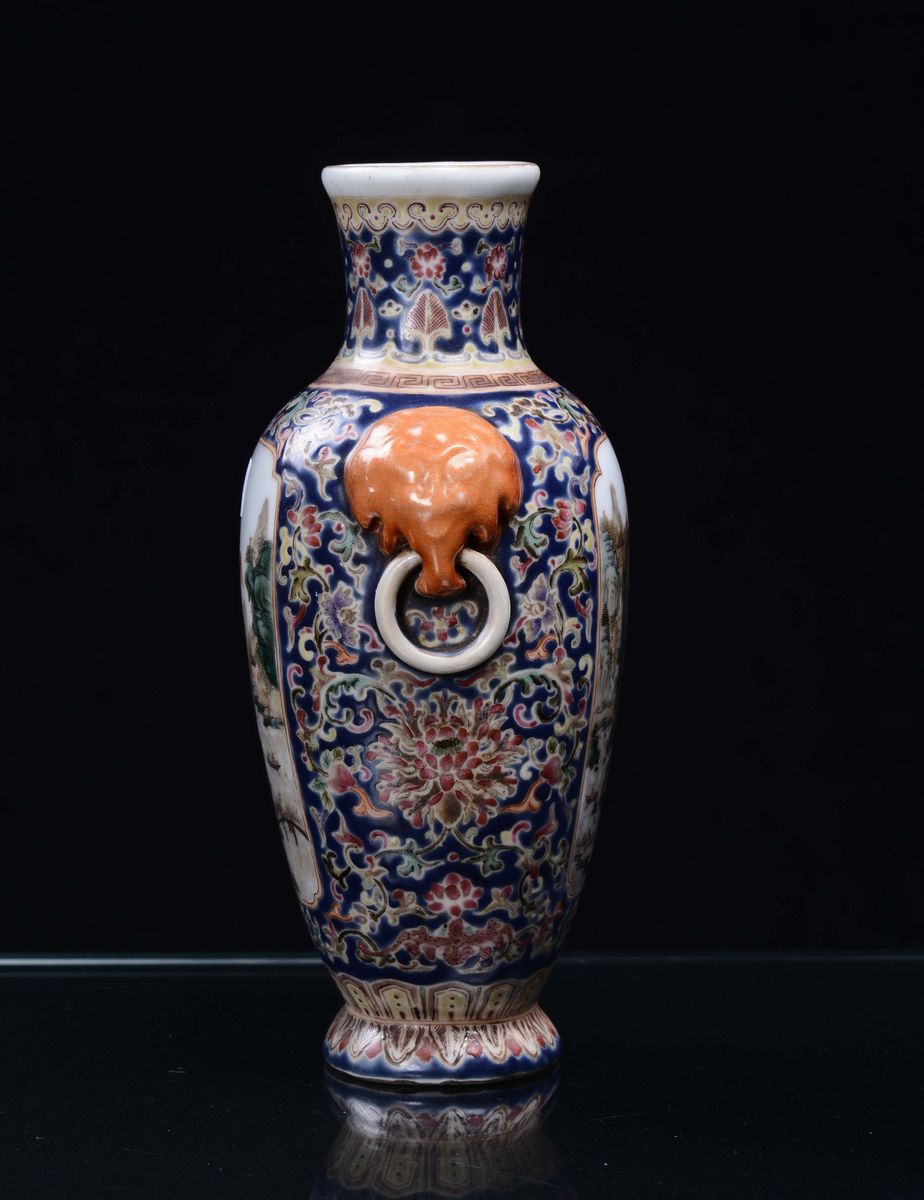 A small polychrome blue background porcelain vase with landscapes, China, Republic, early 20th century