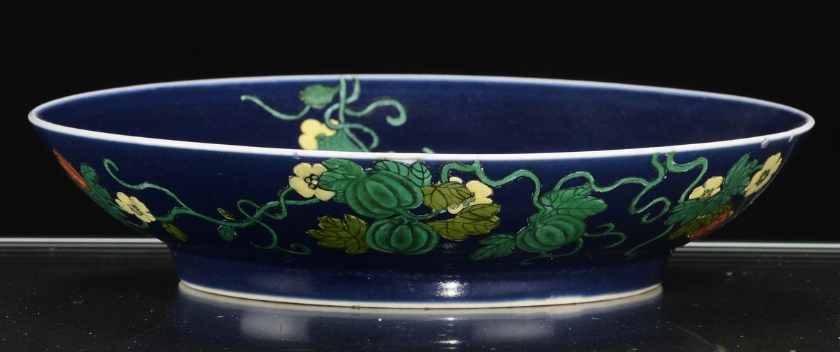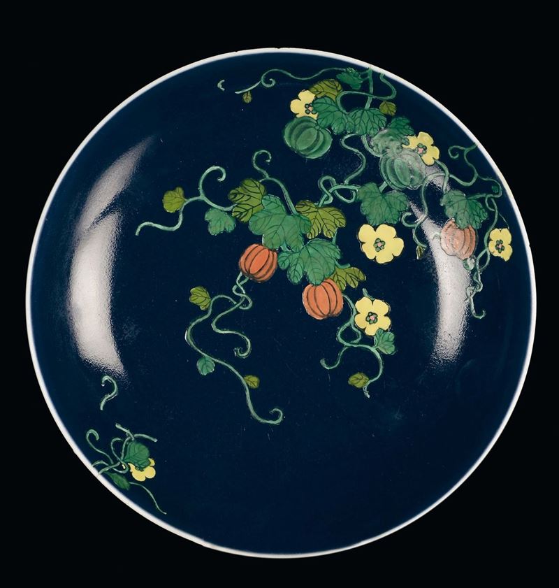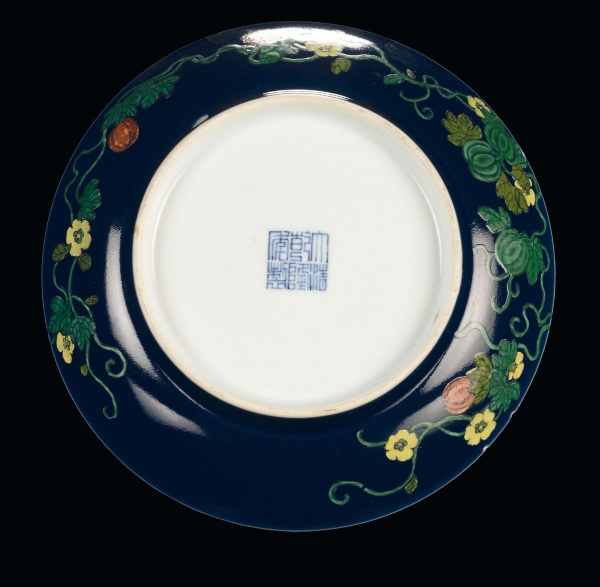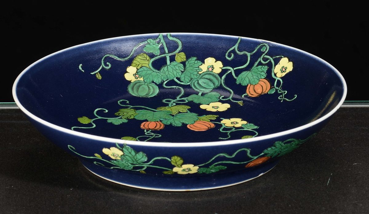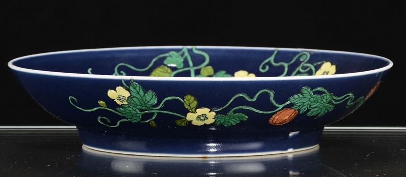 A small porcelain with blue background dish with floral decorations, China, Qing Dynasty, 18th century