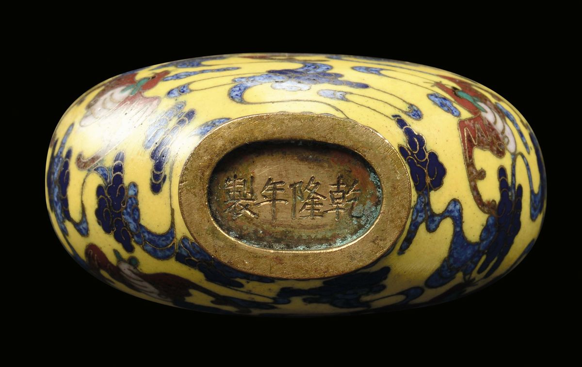 An enamel snuff bottle on yellow background with stylized decoration, China, Qing Dynasty, 19th century