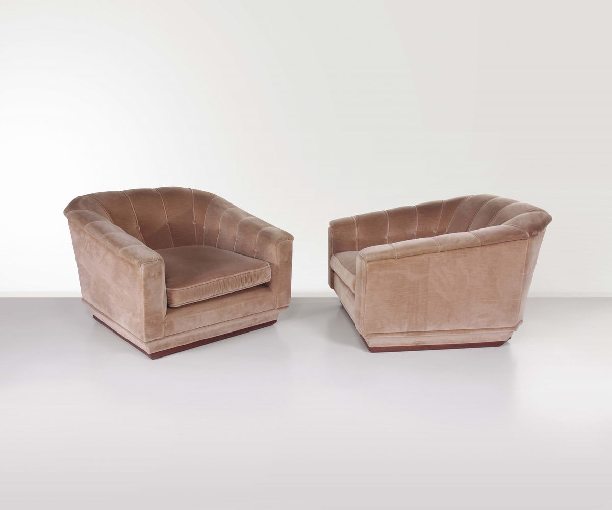Coppia di poltrone in legno rivestite di velluto. Prod. USA, 1950 ca.