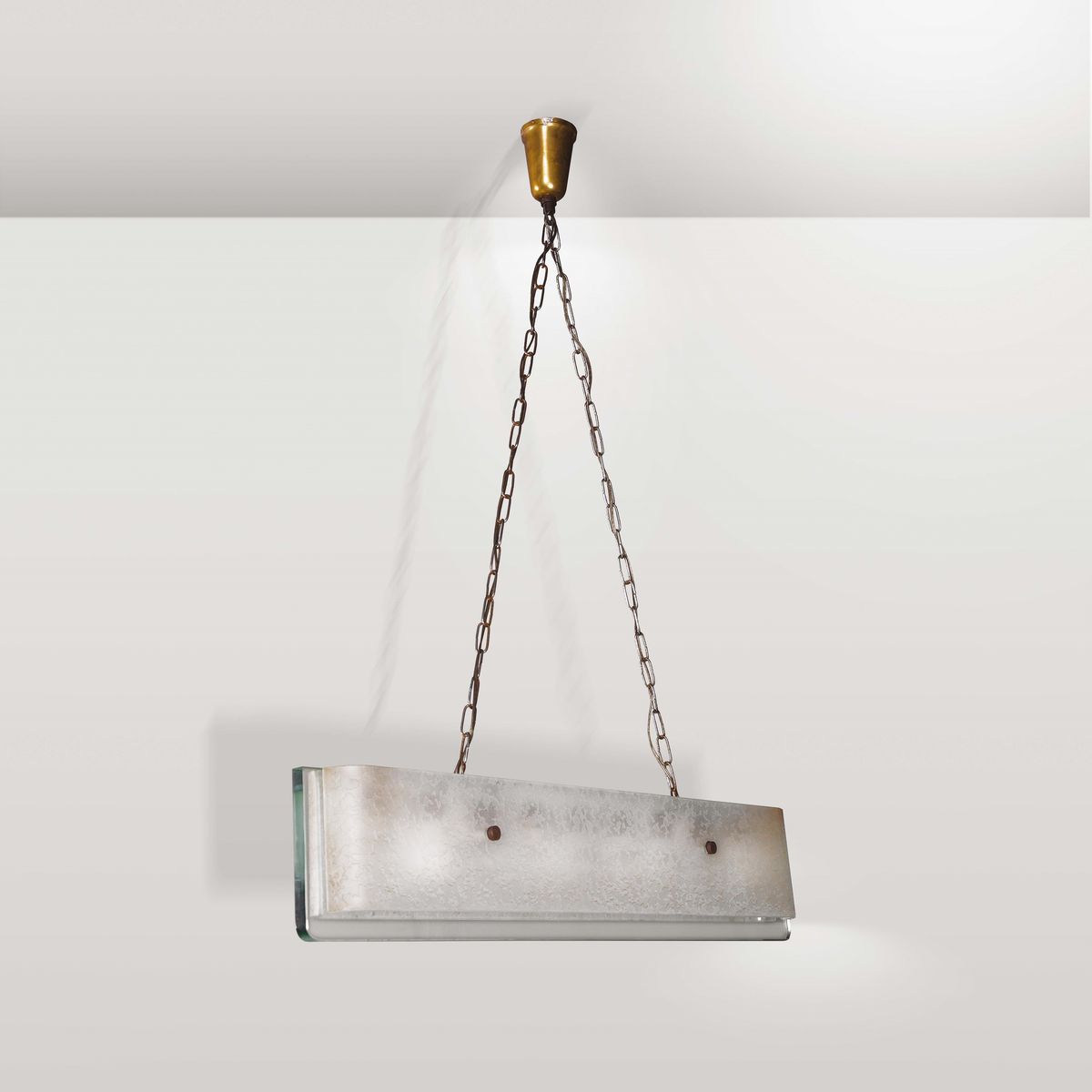 Lampada da sospesione in vetro molato di forte spessore e diffusori in vetro curvato goffrato. cm 90x17x10