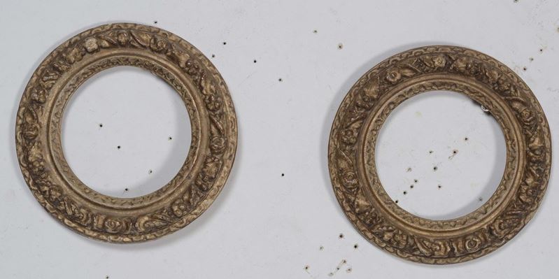 Lotto composto da una coppia di cornici circolari in legno dorato e intagliato e da una cornice in legno dorato