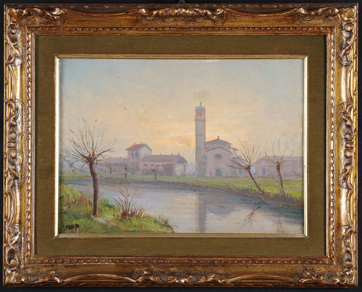 coppia di dipinti ad olio su cartoncino, cm 25x34, firma non leggibile